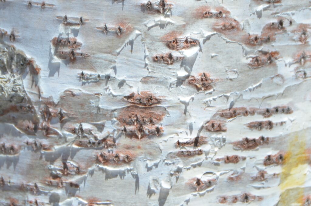 シラカンバの幹を指でさすったらその部分が黄色に!指にも黄色い粉が付着していました。黄色く変色するのは幹がピンクになっている部分だということに気が付き、