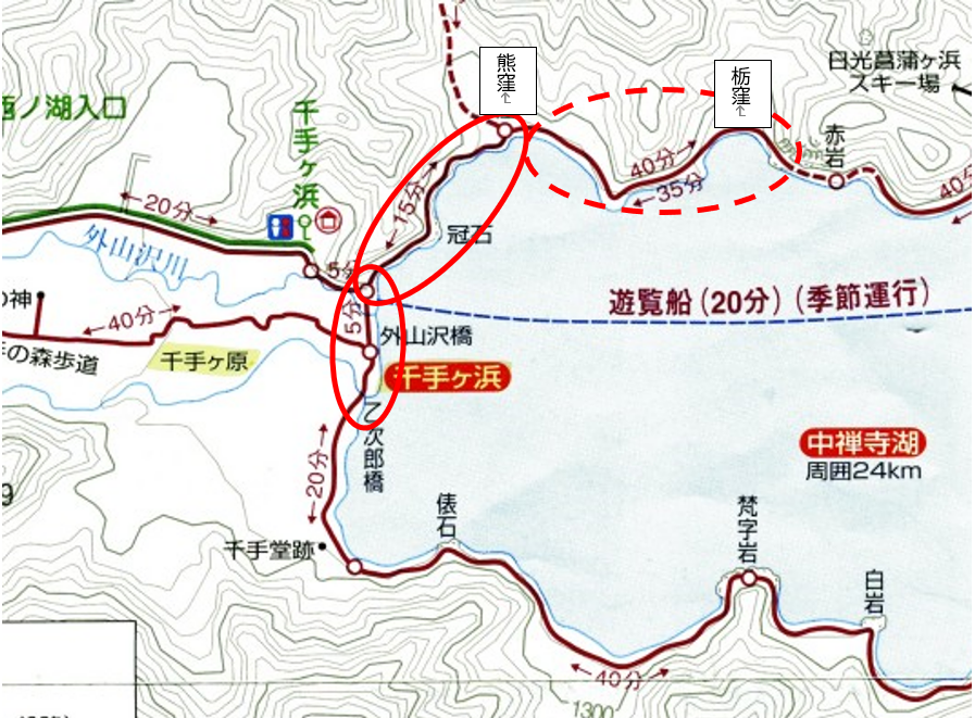 なお、今回ご紹介した場所は地図上の赤丸(実線)のあたり、赤沼から低公害バスに30分乗車し終点の千手ヶ浜で下車。