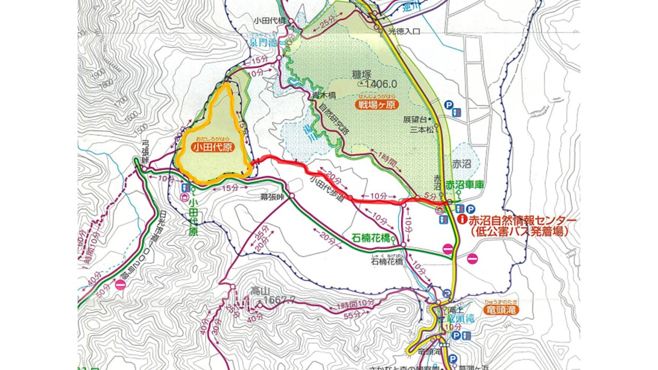 また、赤沼から小田代原を結ぶ小田代歩道も約1時間。(赤線部)