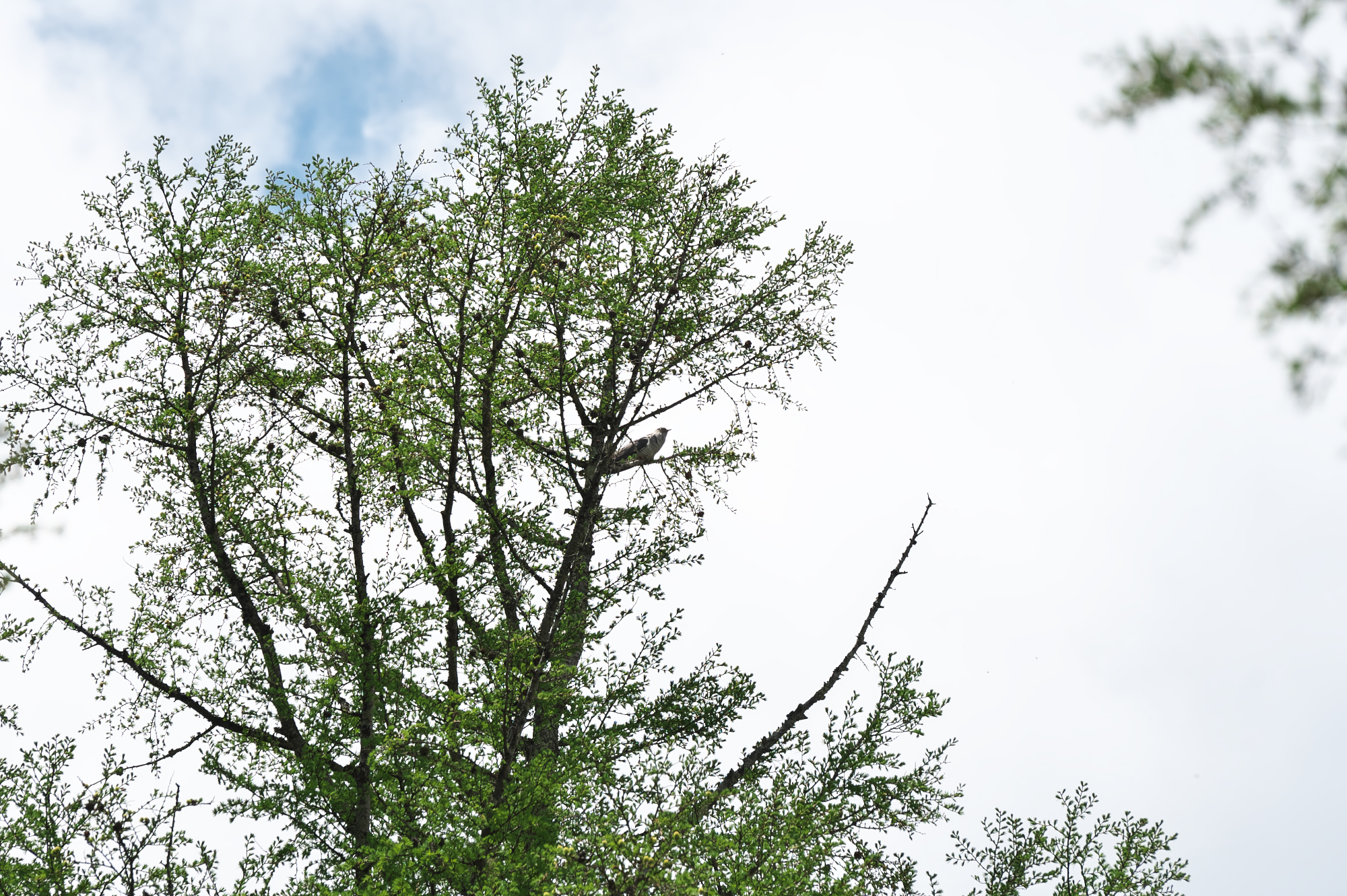 声のする方向、いそうな場所を頼りに探してみると、案の定高い木の先に留まってさえずっているのを見つけました!