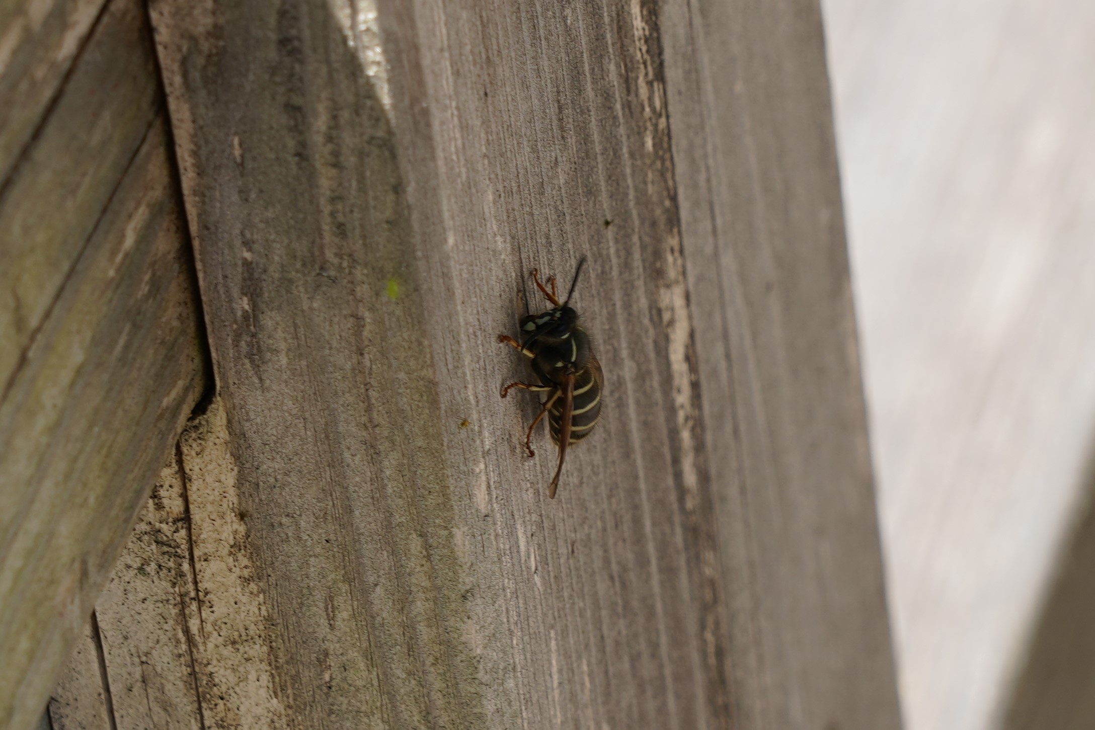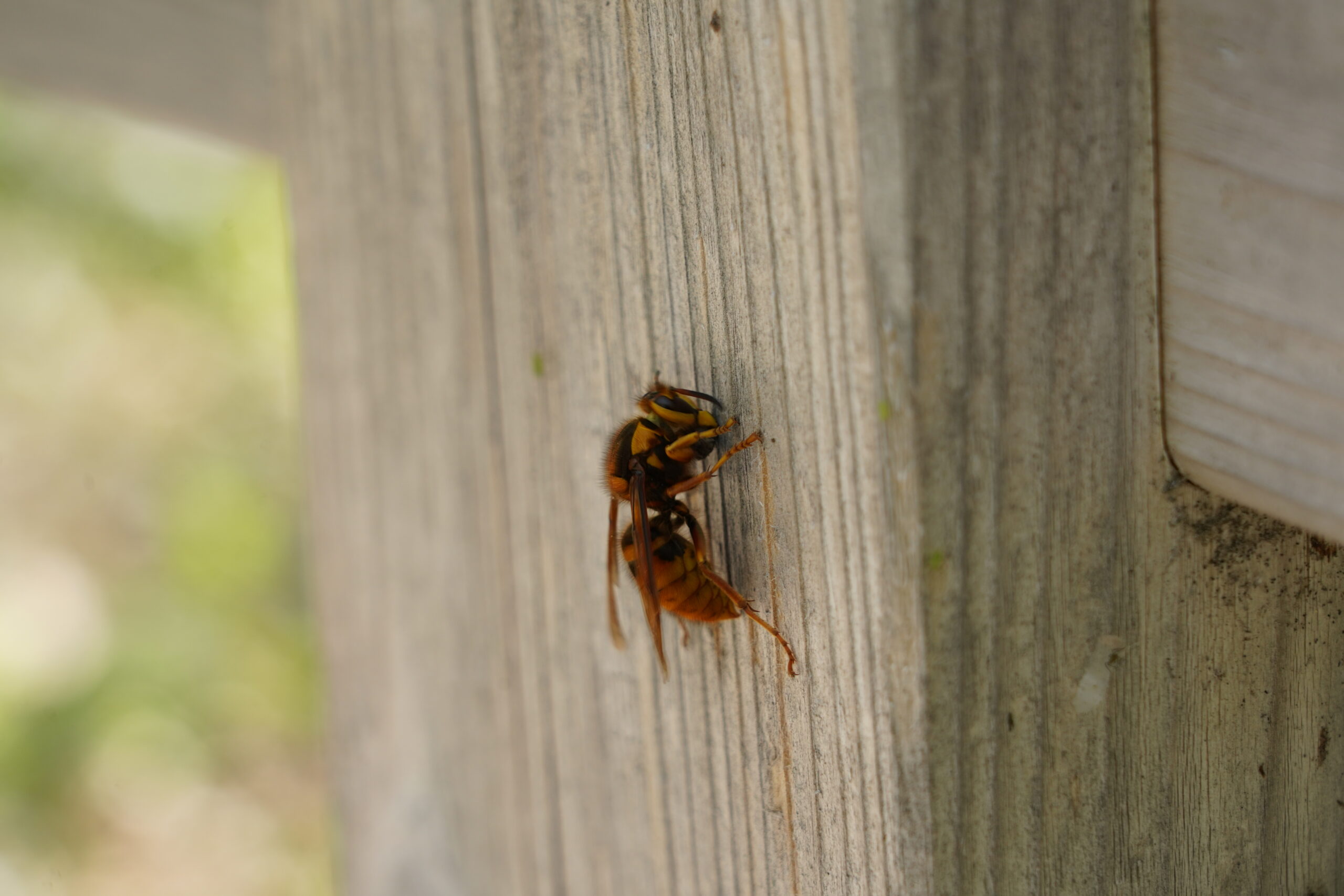 木道のそばの柵では、ハチたちが柵をかじり、せっせと巣材を集めていました。