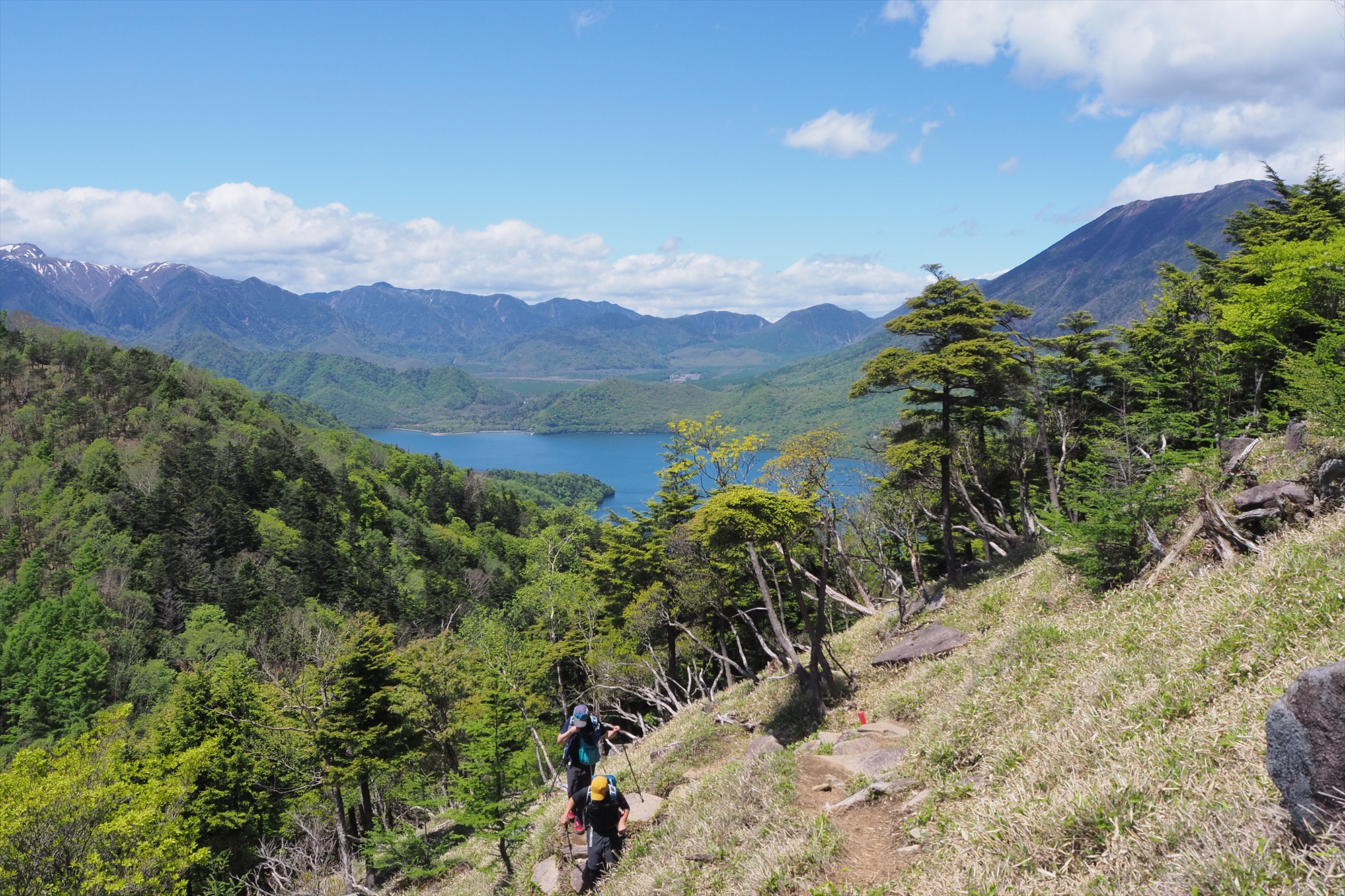 中禅寺湖ブルーと、新緑&常緑樹の色合い様々な緑、白い雲!