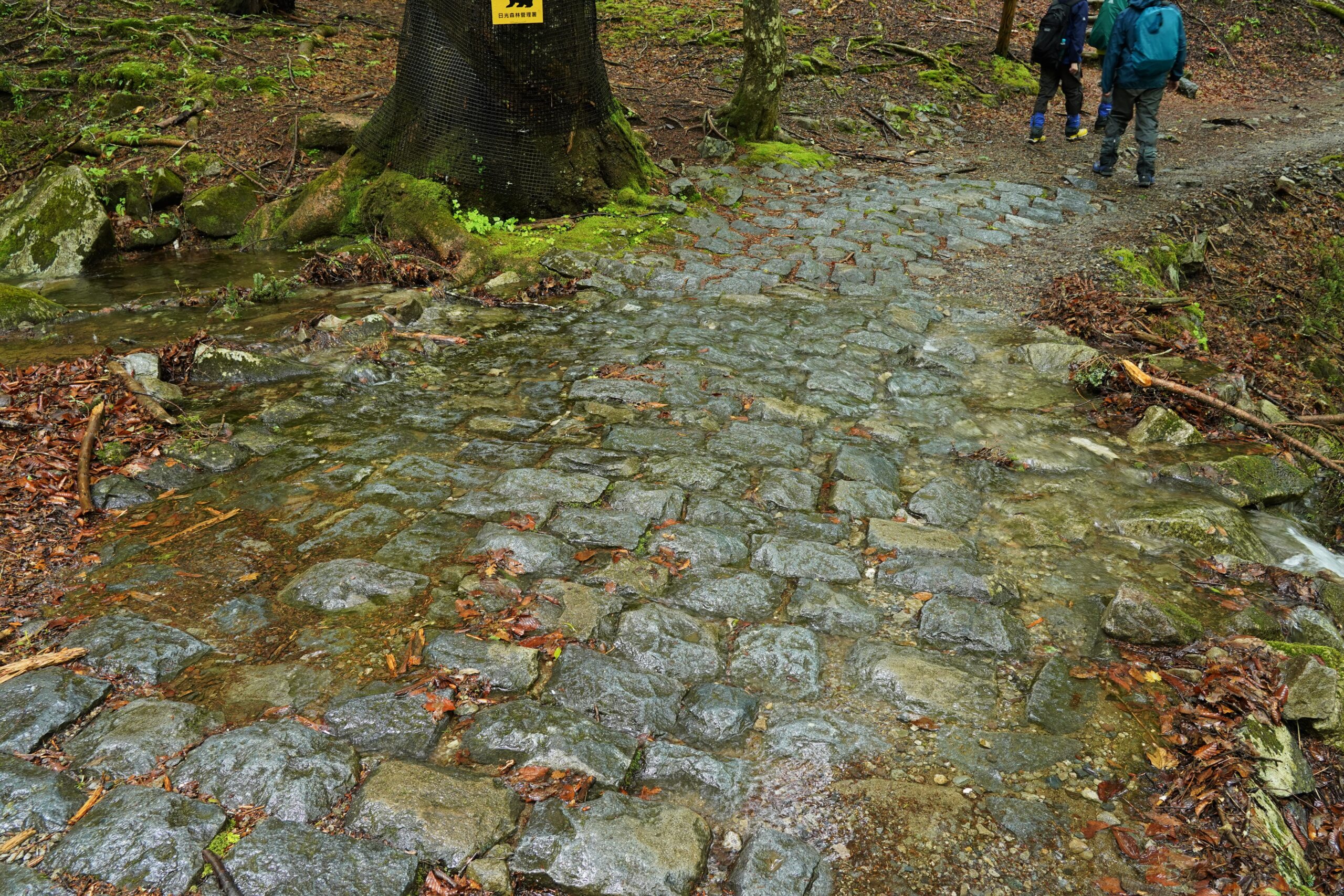 道中では道を遮るように、小さな沢が出来上がっています。上手に渡らないとずぶ濡れに・・・