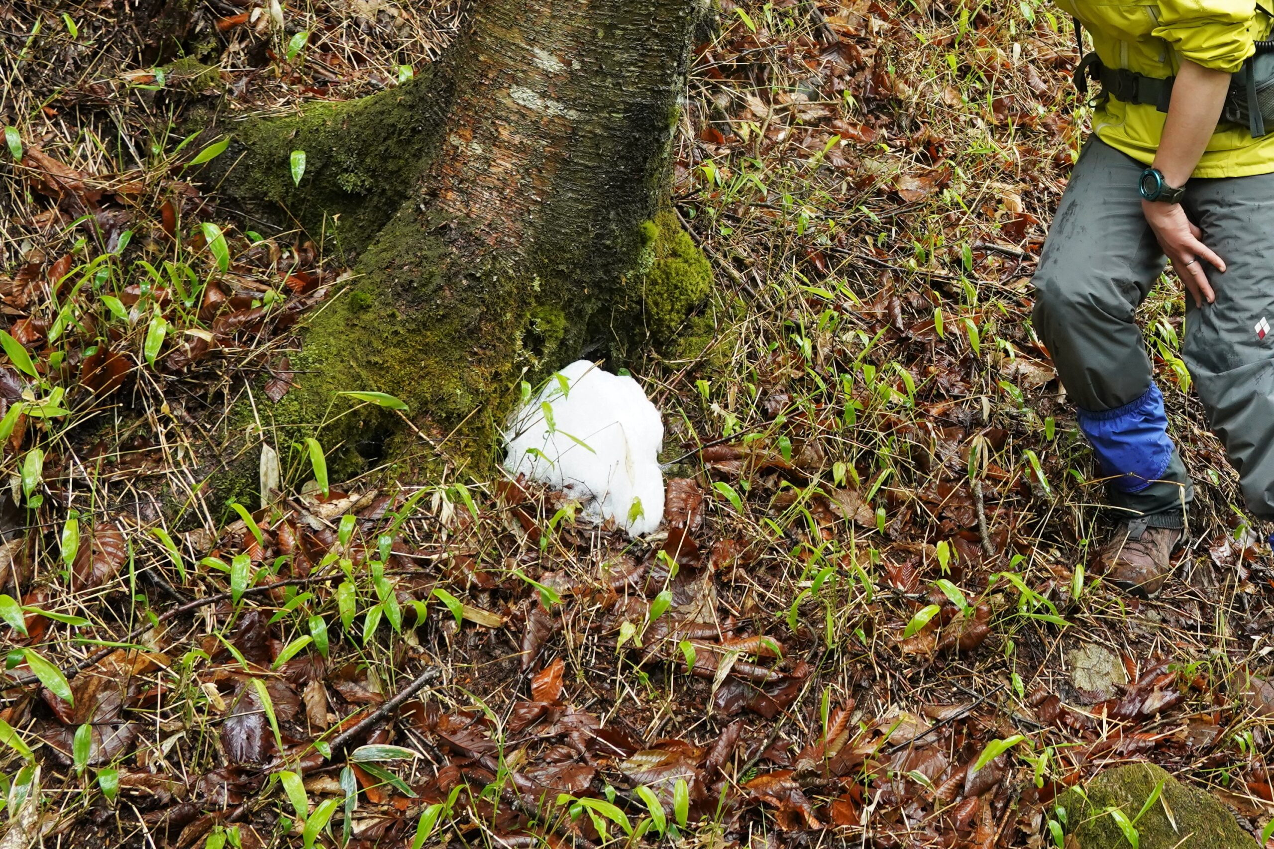 木の根元に目立つ白い泡。ピンポン玉サイズから手のひらサイズまで、様々なサイズの泡があちらこちらの樹に目立ちます。