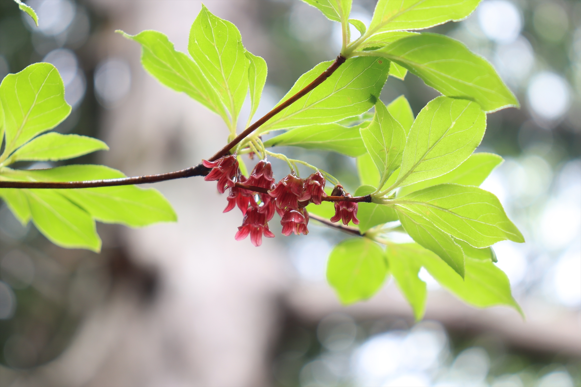 針葉樹が多く生えているのは山側。国道側は生えている植物が少し変わり明るいです。国道側にはベニサラサドウダンというお花が咲いています!