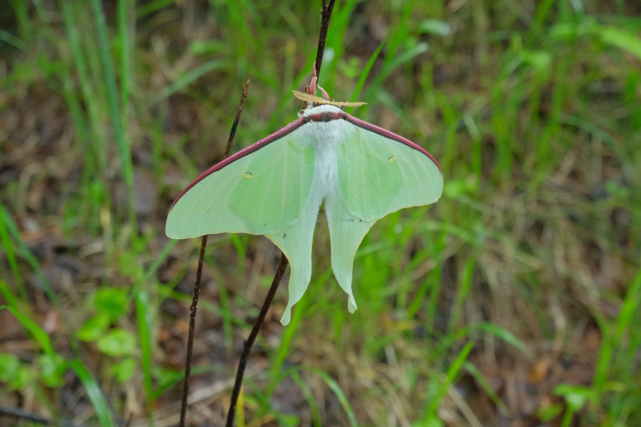 道端には、きれいなオオミズアオがそっととまっていました。