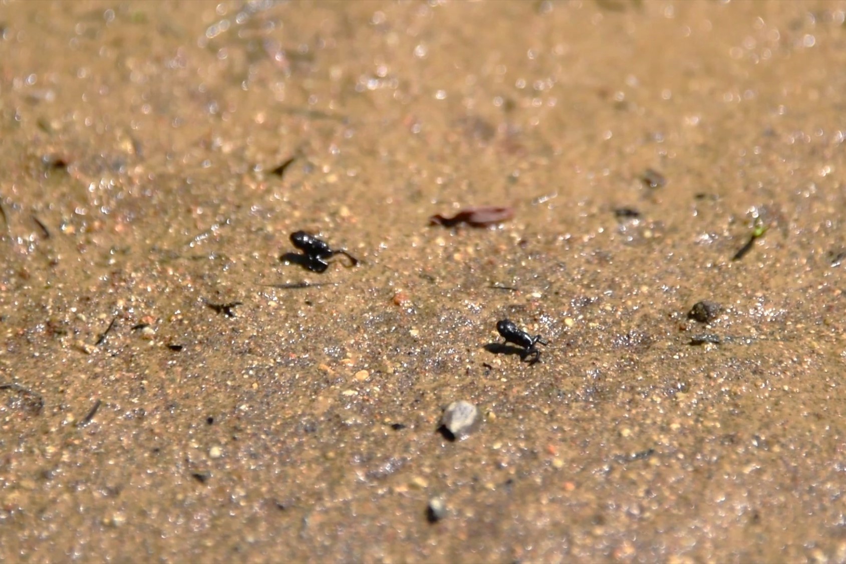 光徳沼の近くの水たまりの周辺を見ていると、黒くてとても小さなものが動いていました。