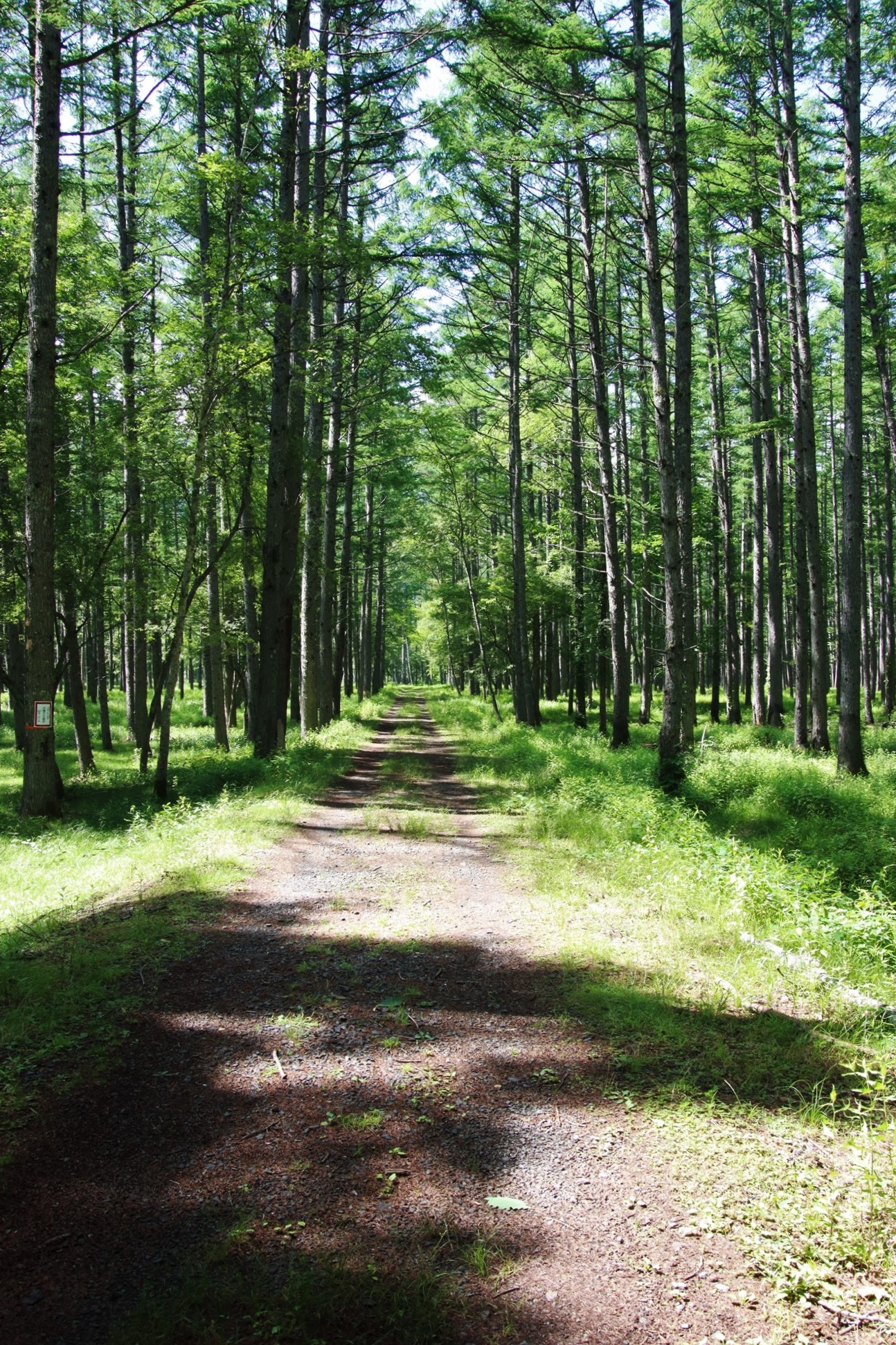 この場所は下草が低く、木もカラマツがまっすぐに立ち並んだ森になっています。