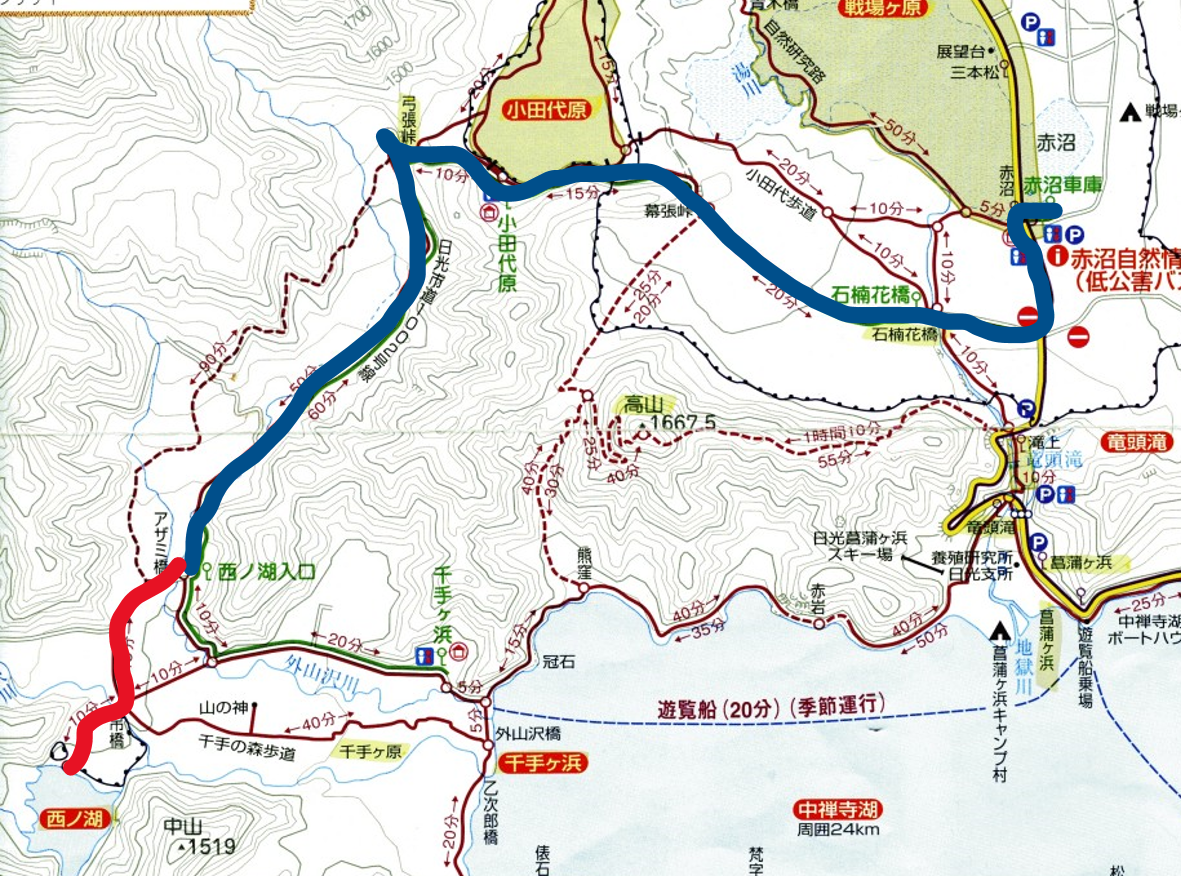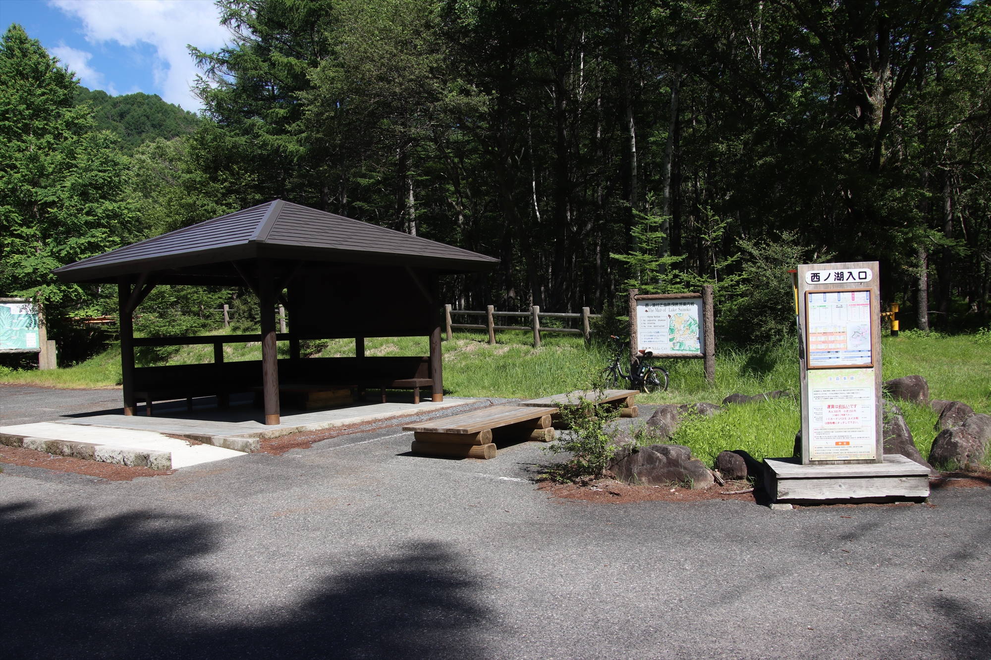西ノ湖は低公害バスを利用すると赤沼駐車場から西ノ湖入口の停留所まで約20分。そこから歩いて30分ほどで行くことが出来ます。