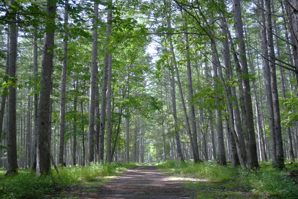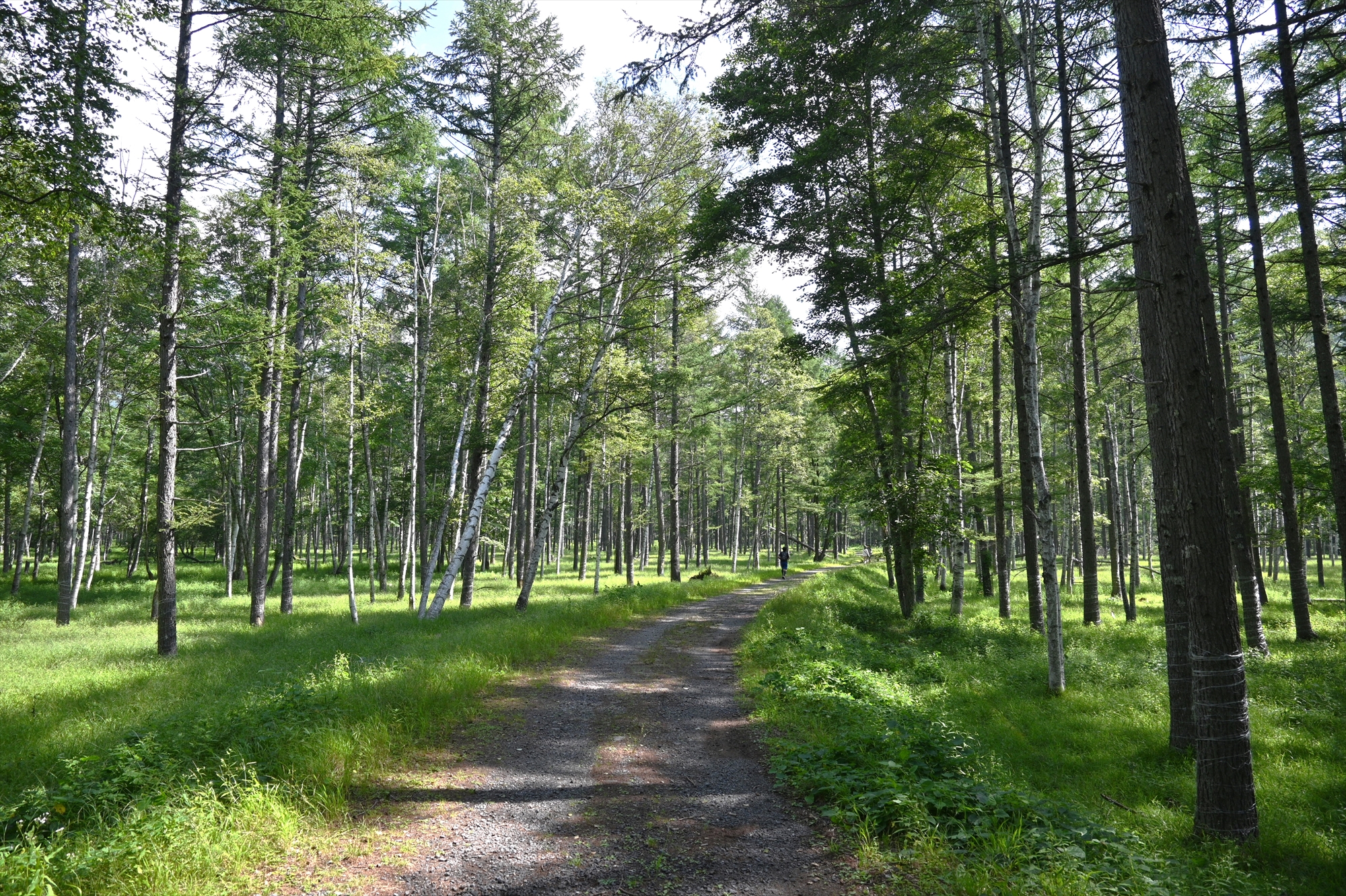 西ノ湖入口から柳沢川に突き当たるまでは、カラマツやシラカバの明るい雰囲気の森が広がっています。