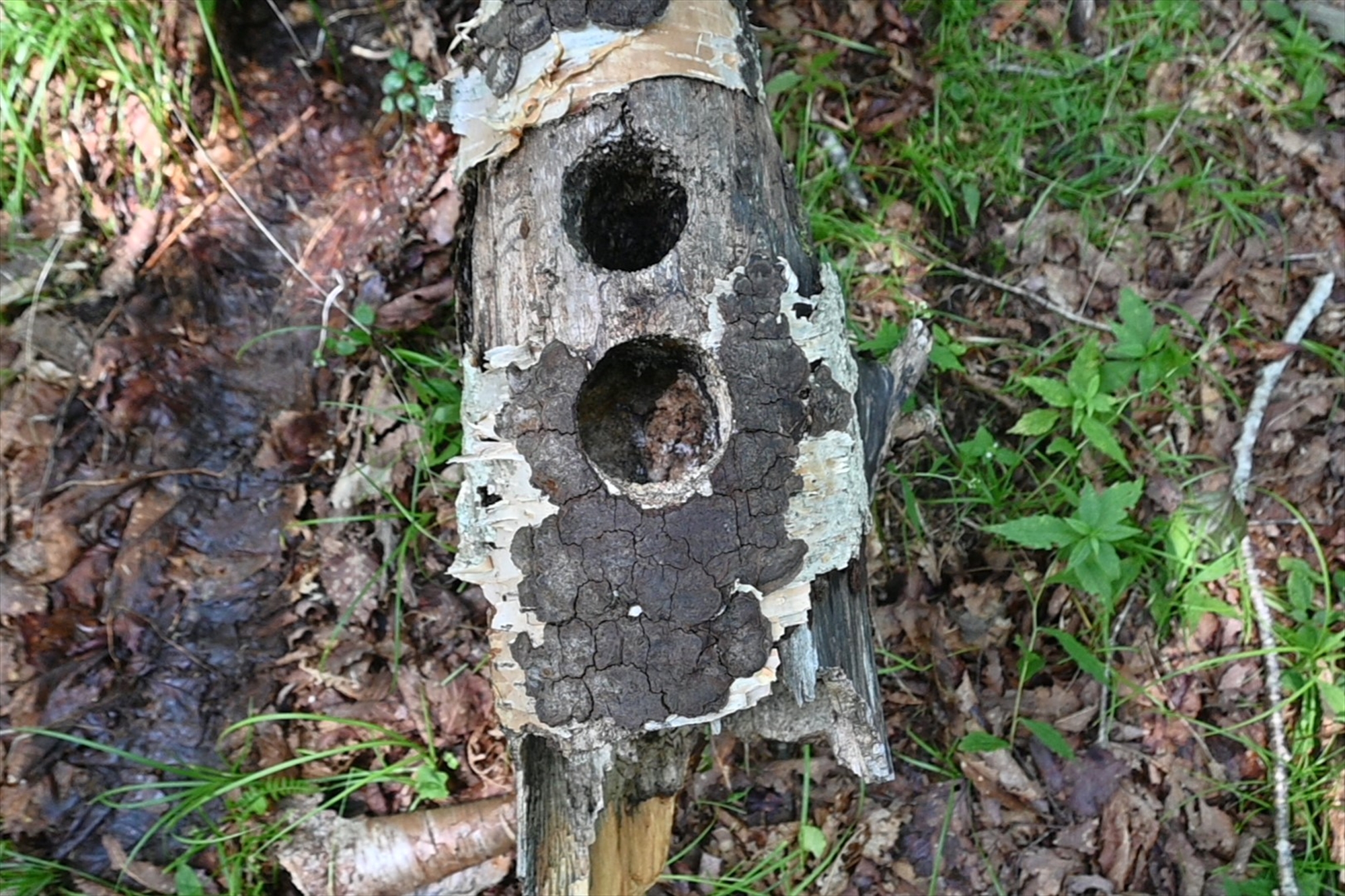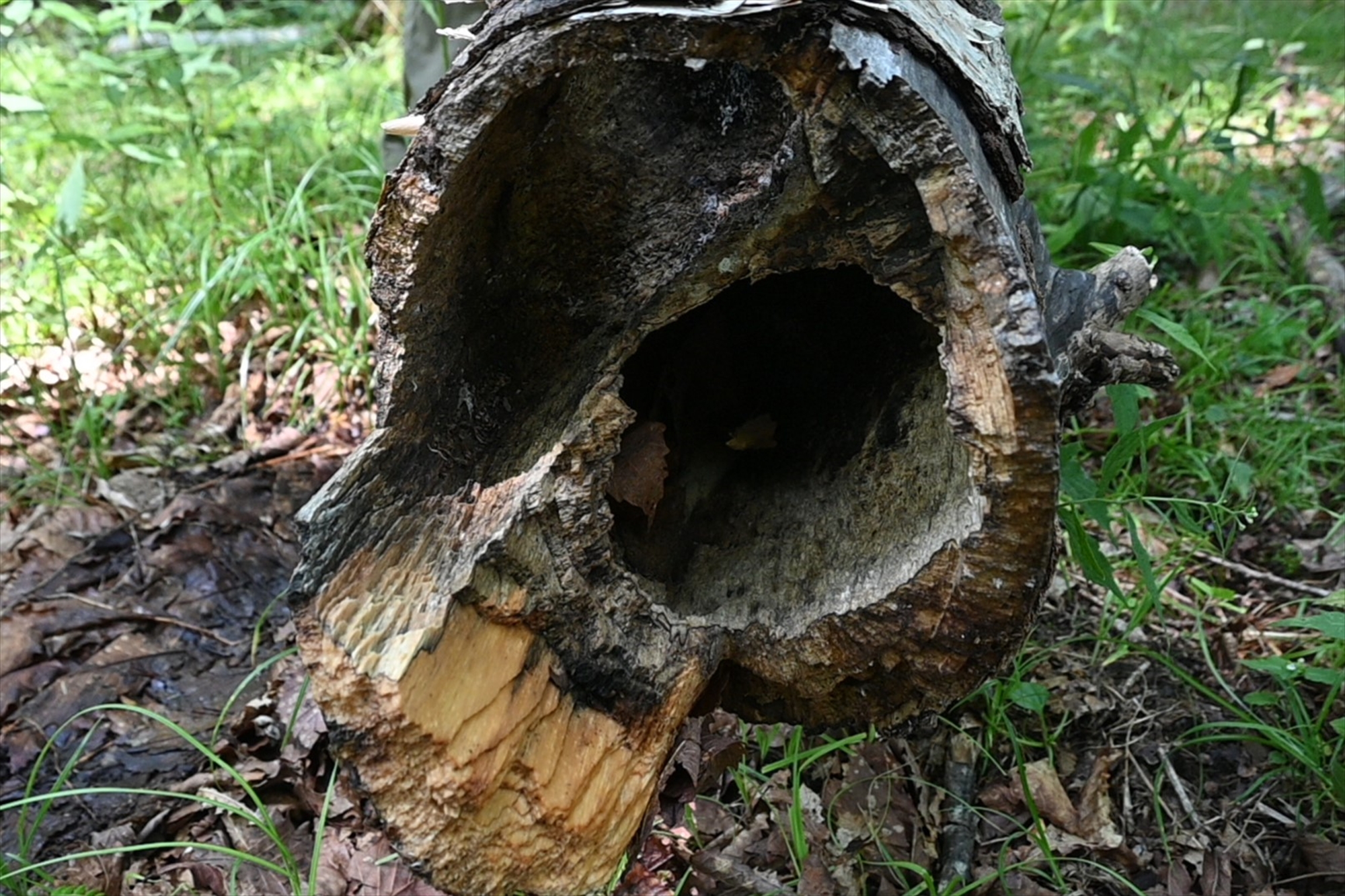直径20cm程の折れて落下した木を発見しました。この穴はキツツキが掘ったもので、下の穴は奥まで深く掘られていることがわかりました。