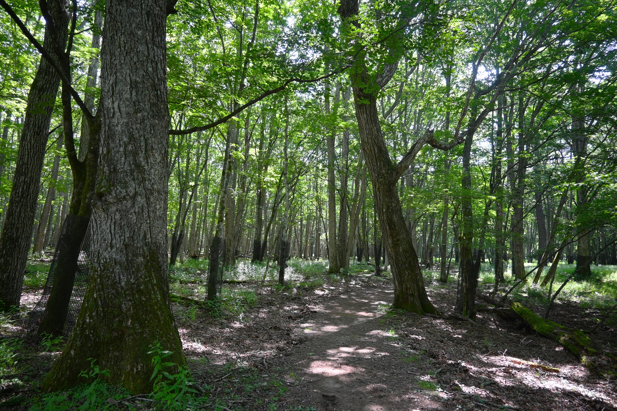 千手ヶ浜方面に歩みを進めていくと、ミズナラなどの大木が増え、暗い雰囲気の森へと変わってきました。