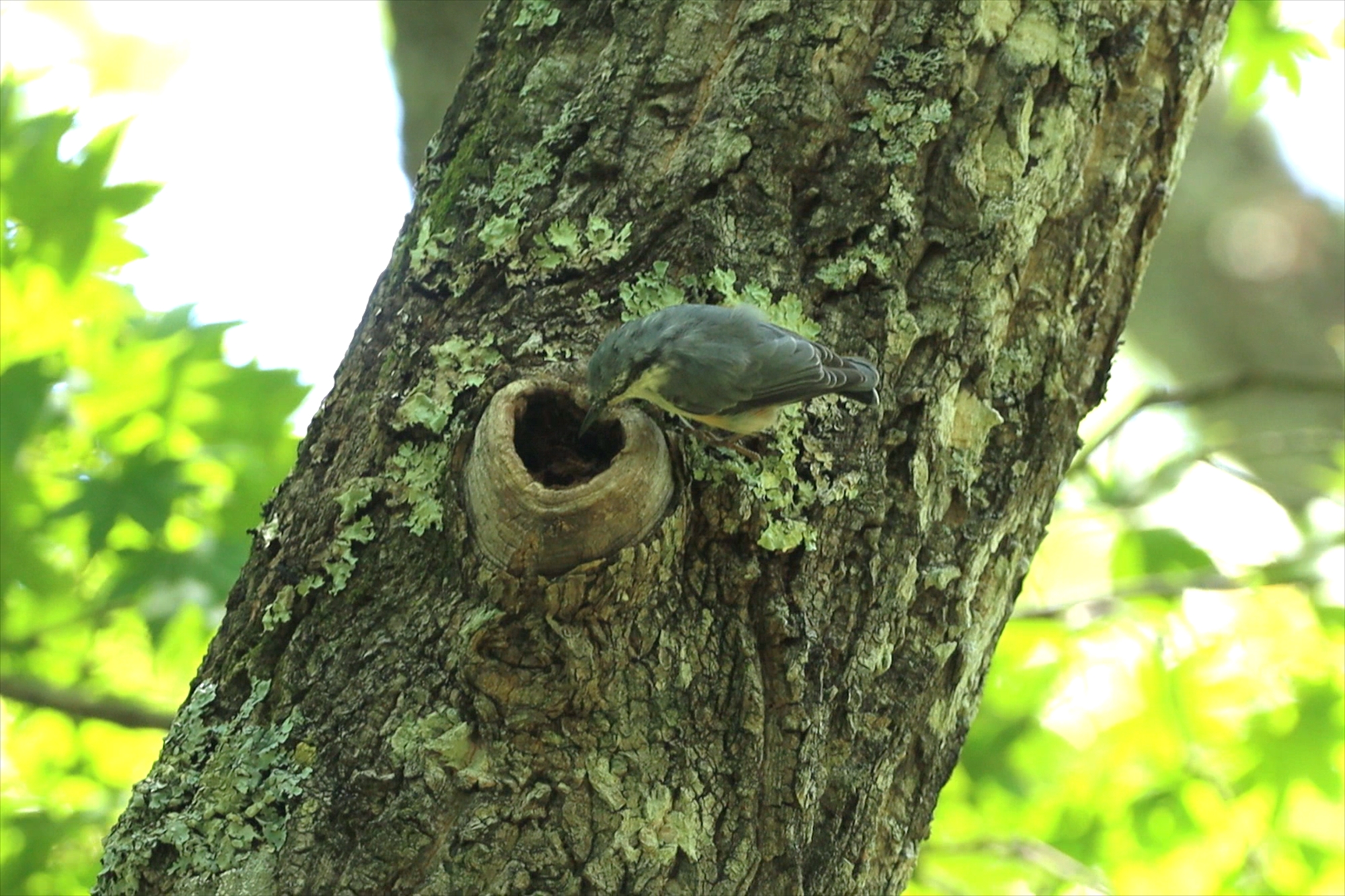 穴をのぞき込むこの鳥は、ゴジュウカラです。観察しているとなんと頭を下にして垂直に木を下り始めました!