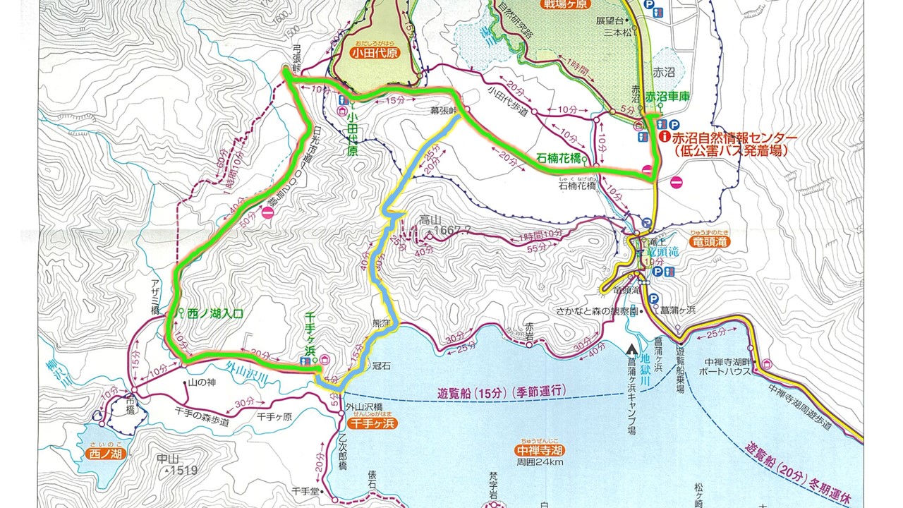 緑線:低公害バス路線、青線:高山入口~熊窪~千手ヶ浜