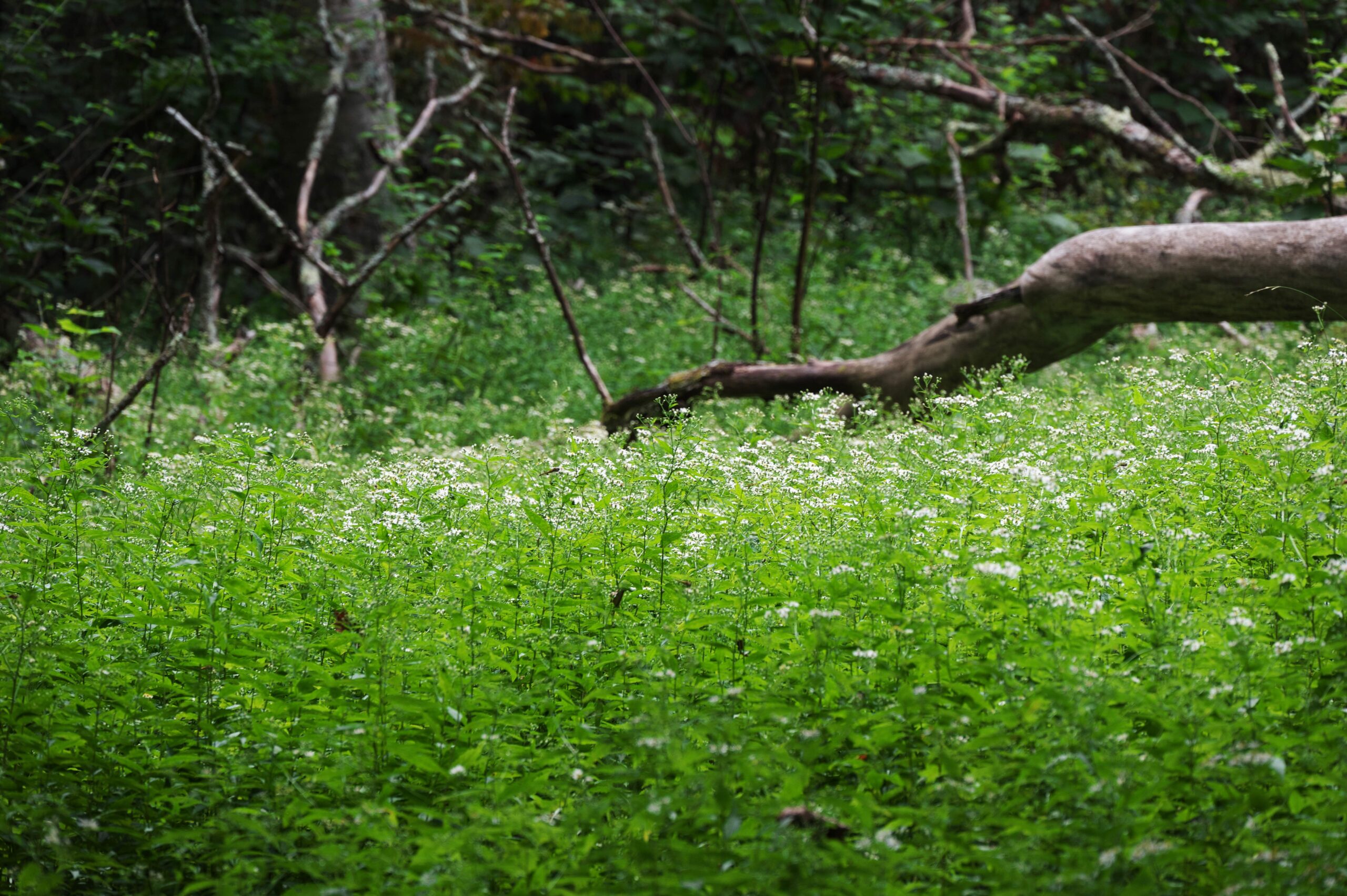 シカが食べている影響でササの草丈が低く、シカの好まないシロヨメナという植物が白いお花畑を作っていました。