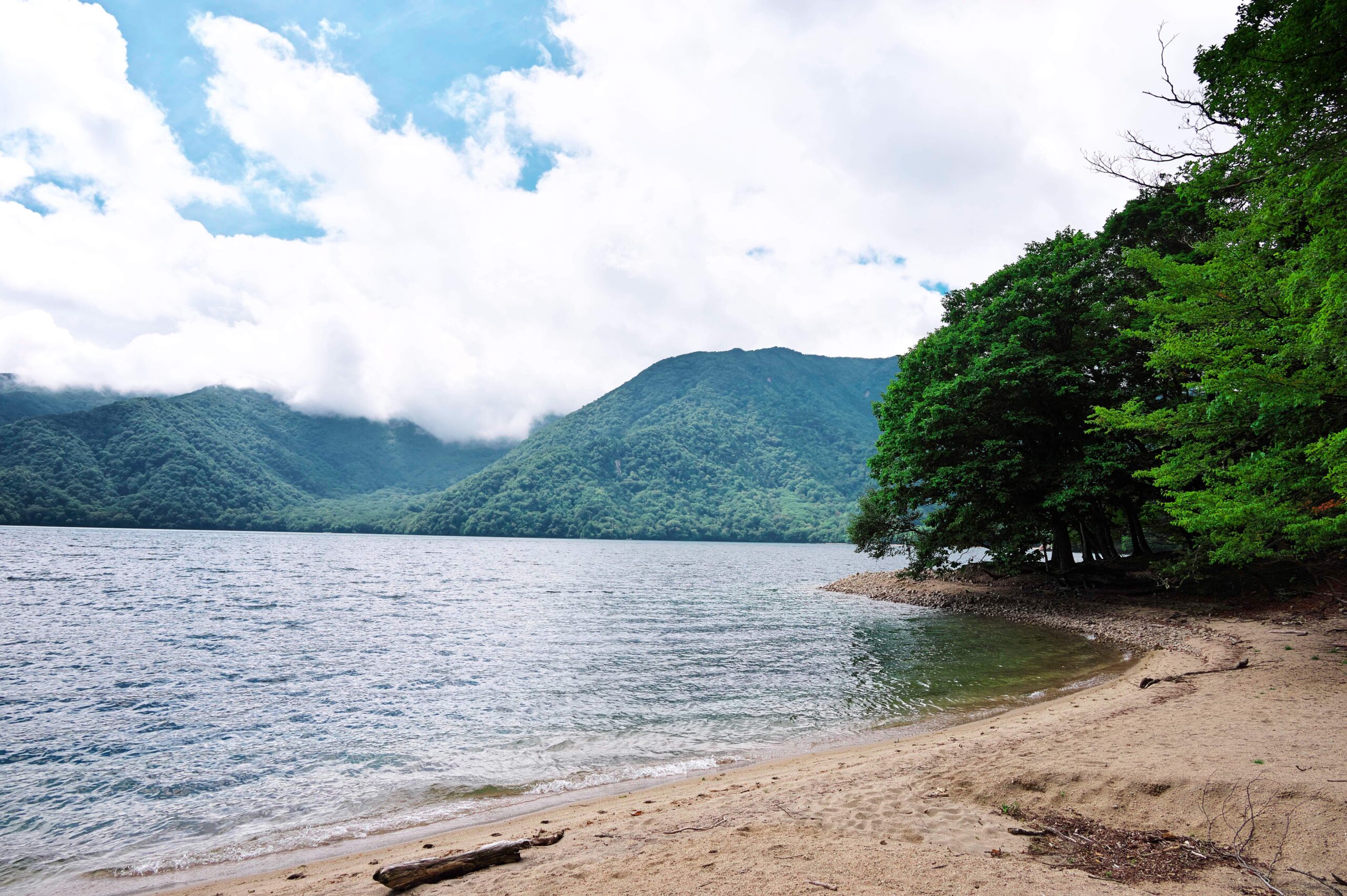 峠を越えて中禅寺湖北側の熊窪では、波の打ち付ける白い浜が広がっています。