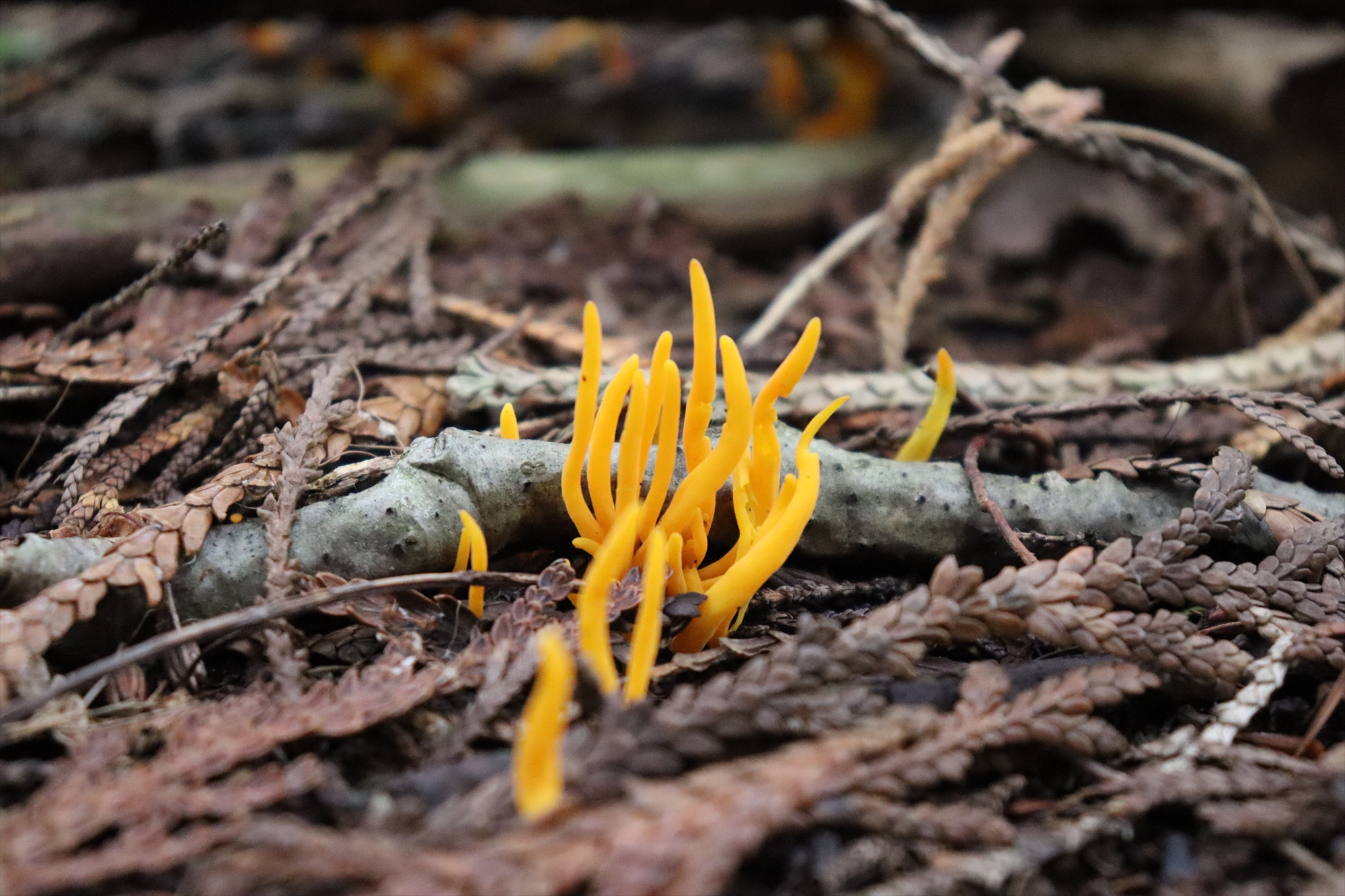 まるで海にいるサンゴみたい!おそらくナギナタタケの仲間。名前の通り薙刀のように細長く棒状で、大きさは5センチほど。地面から数本~十数本がまとまって生えます。