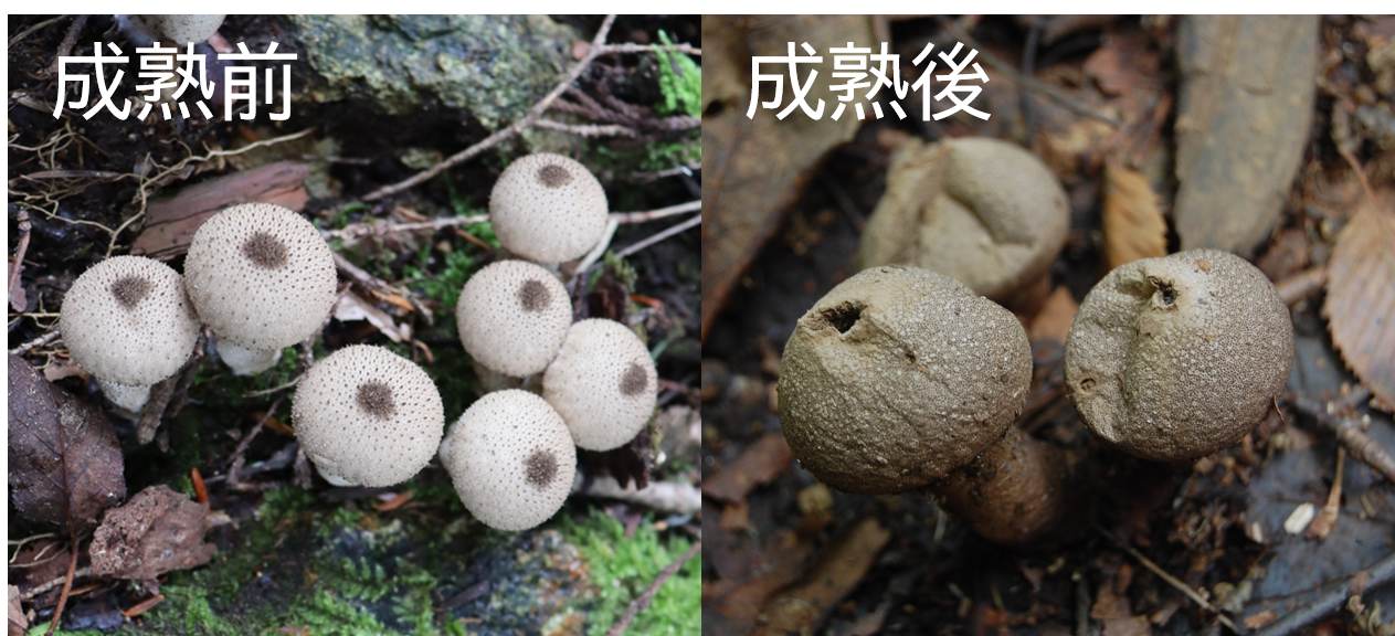 このキノコは成熟すると中心部に穴が空き、「胞子」いわゆる種のようなものが飛び出るんです!キノコをつまんで空気胞みたいにボフッと胞子を出すのがすごく面白い!(やりすぎ注意です。優しくつまみましょう。)