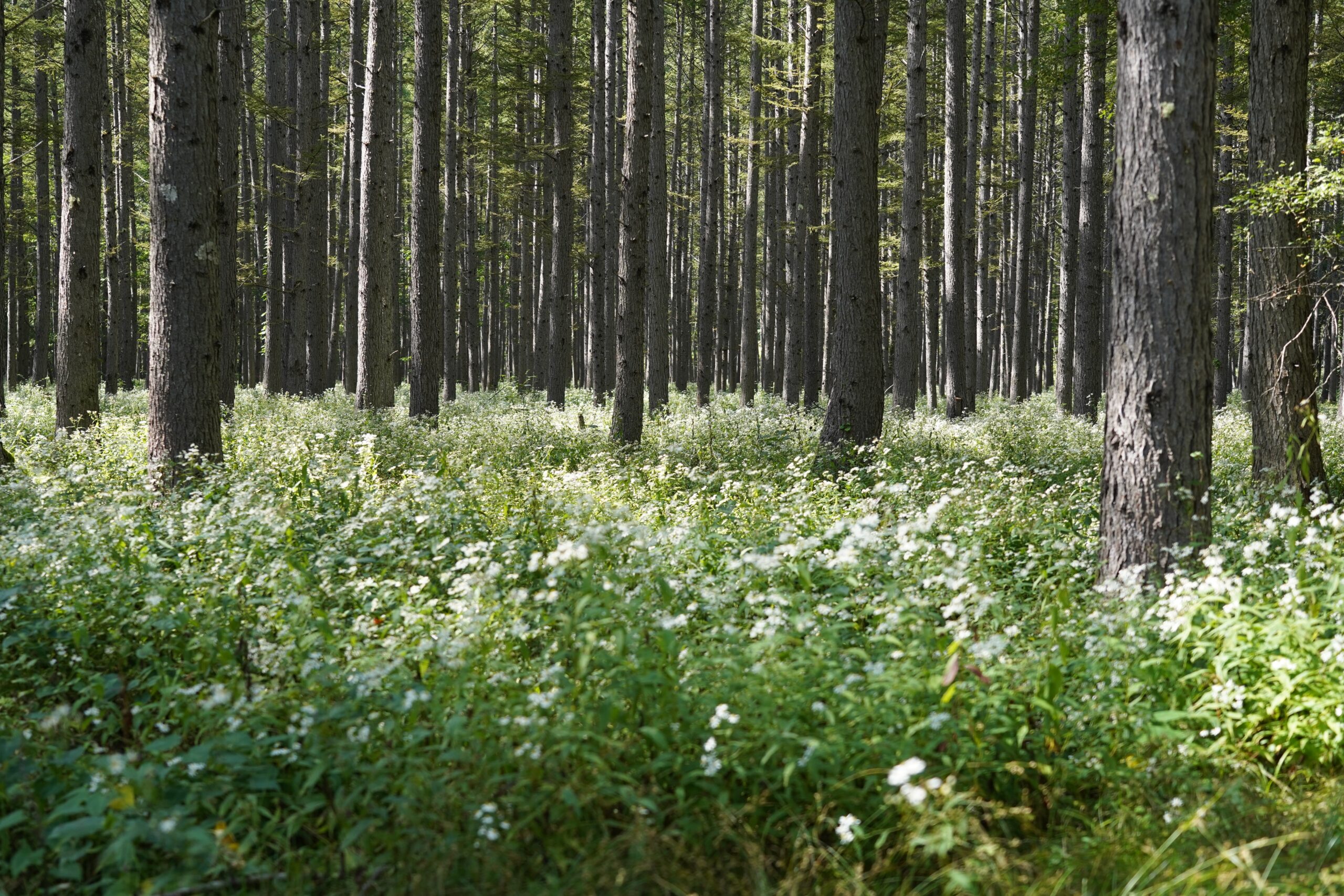入口の外山沢にかかる橋を越えると林の中に白いお花畑が広がっていました。