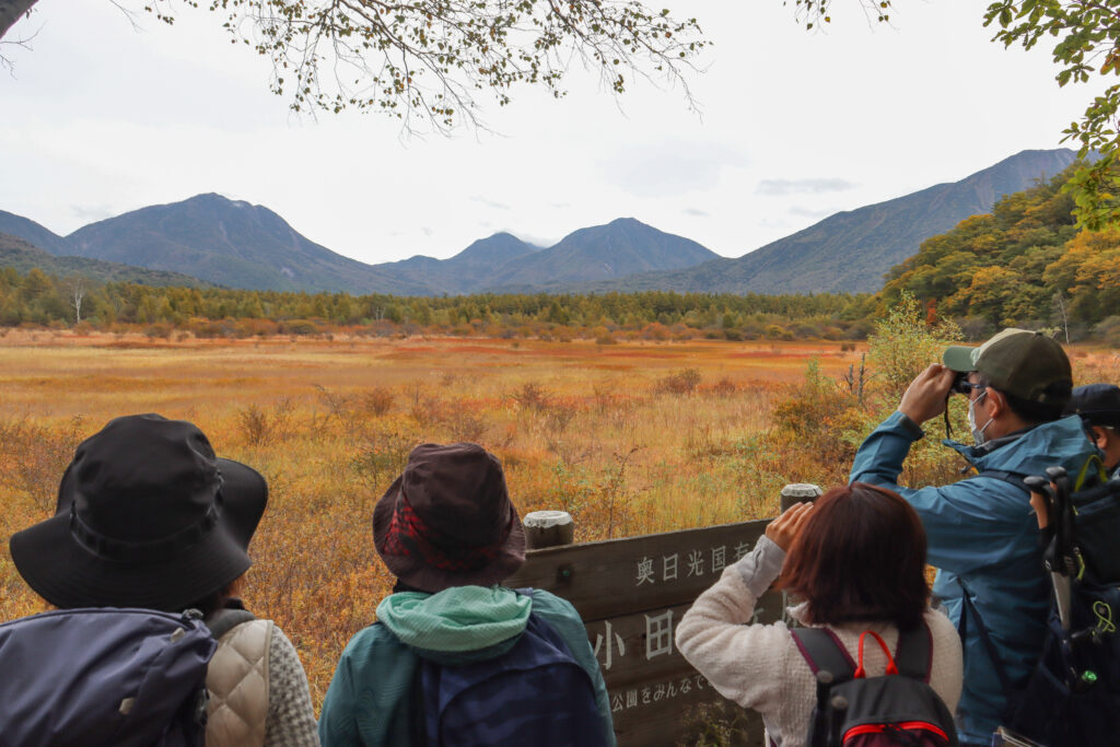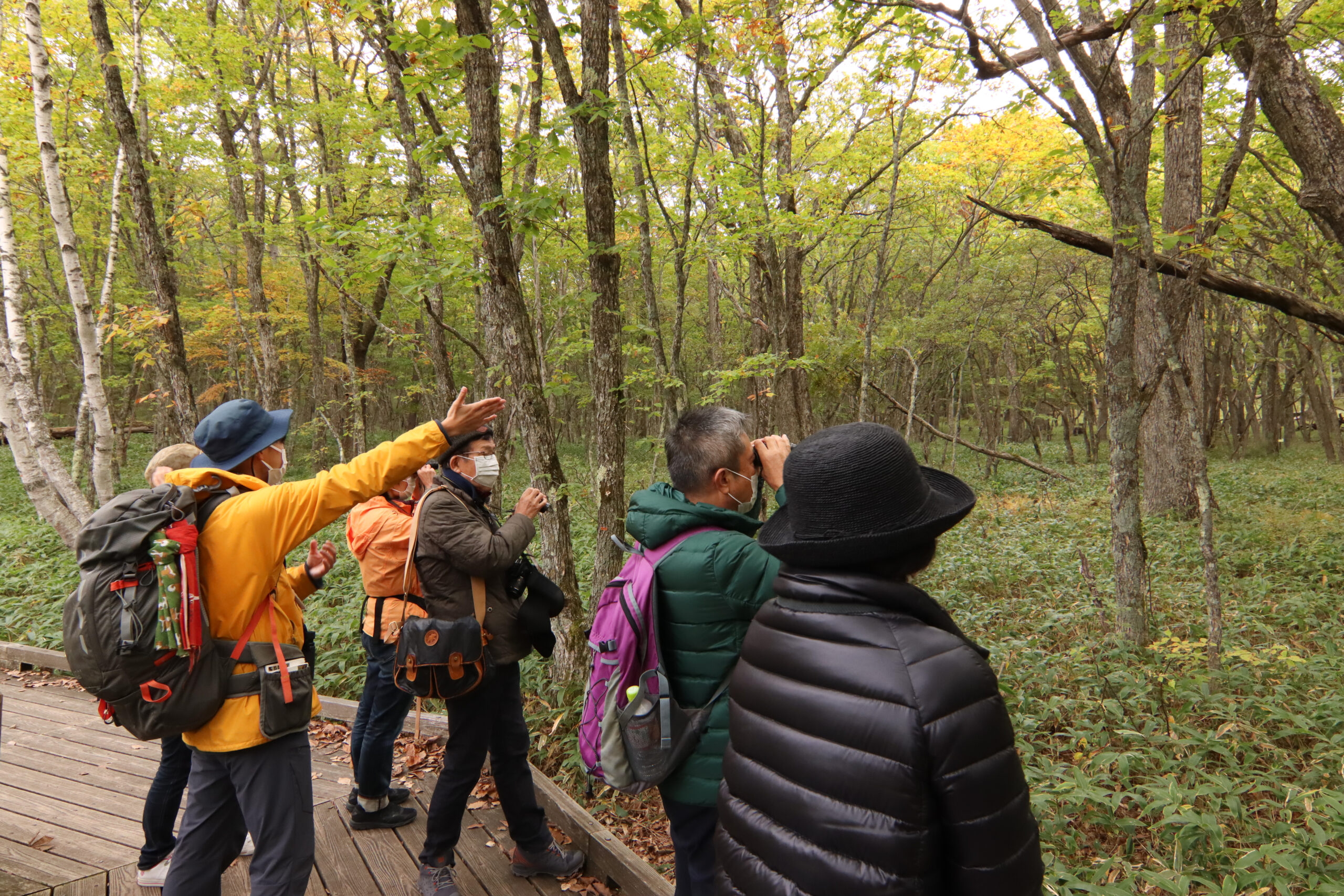 ゆっくり歩いて紅葉を眺めるだけでなく、小田代原の自然を解説しながら進み、飛んできた野鳥を観察したり、