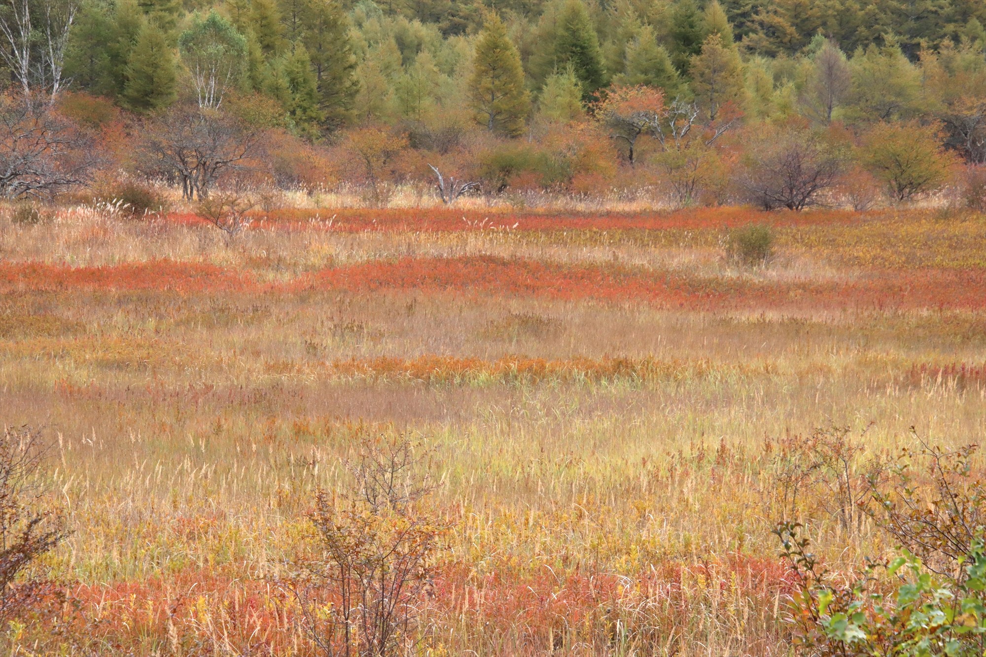 9月下旬、初回の頃の草紅葉はハクサンフウロやノアザミ、イネ科植物の穂などが様々な色でグラデーションを作り出していましたが、最終回の10月9日では、ホザキシモツケの燃えるような赤がとても目立っていました。
