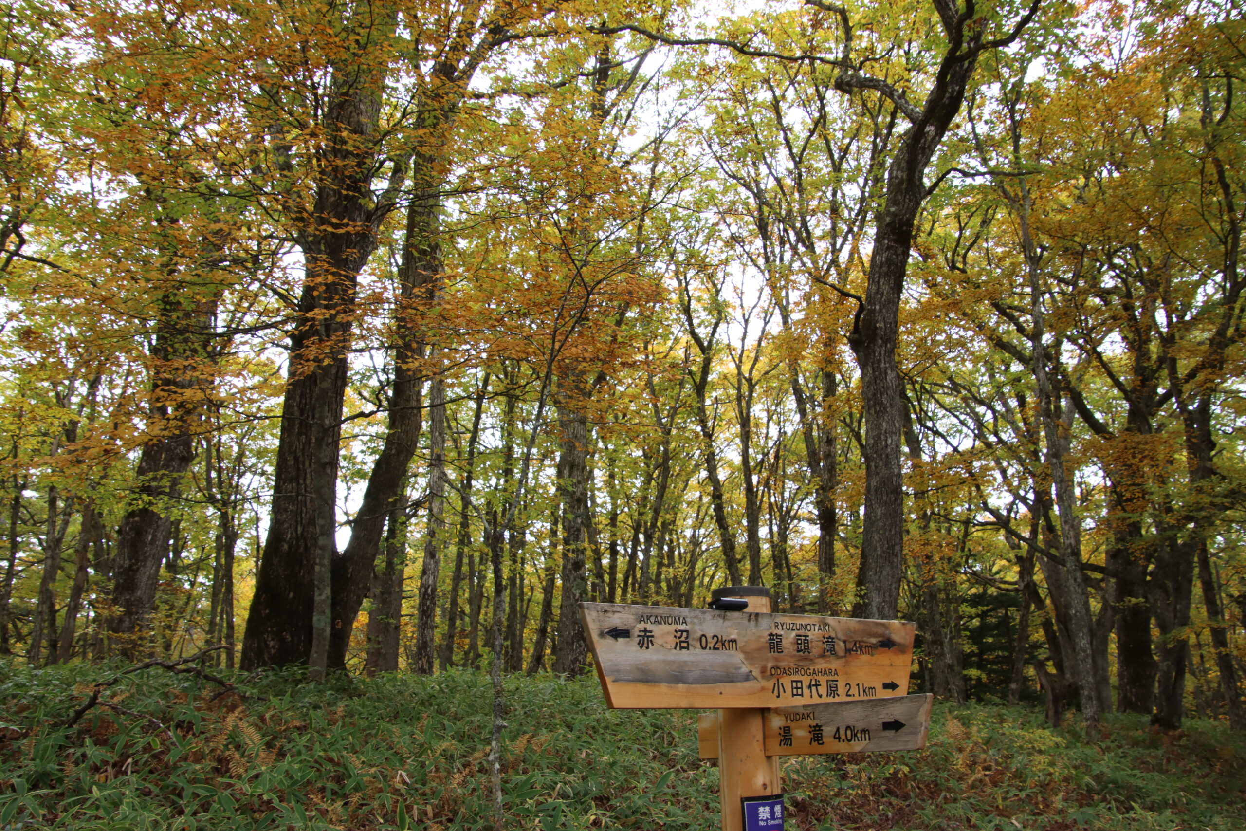 赤沼から木道に入るまでの土の道もミズナラの黄葉が進んでいて綺麗です。