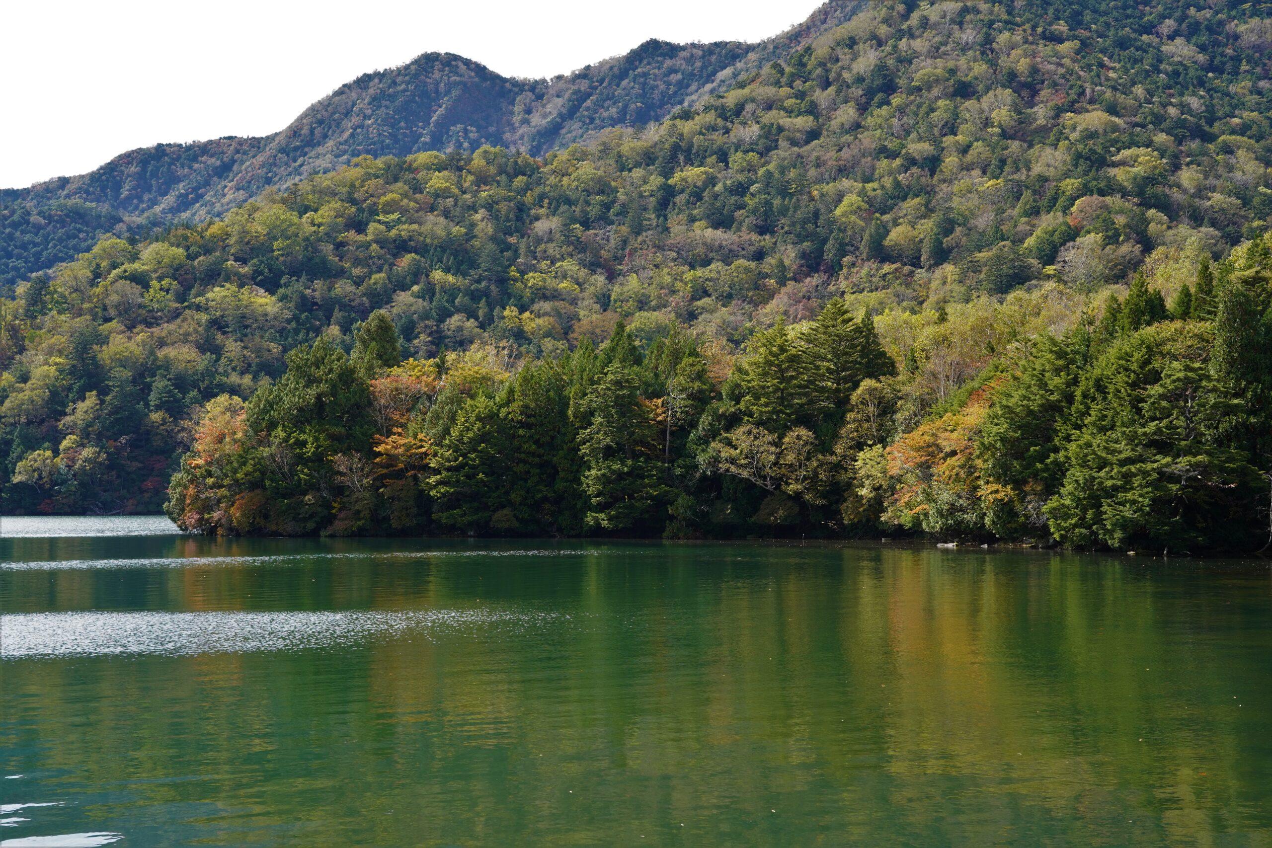 湖面そばの木々は色づきが濃くなり、湯ノ湖全域で赤が目立っていました。