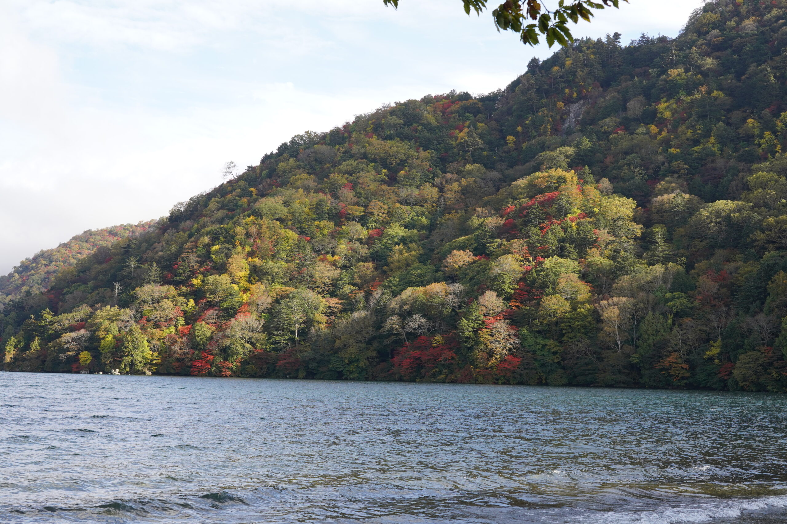 千手ヶ浜では南岸の山肌が見頃を迎えていました。中禅寺湖の波の音を聞きながら紅葉を楽しむのも風情がありますよ!