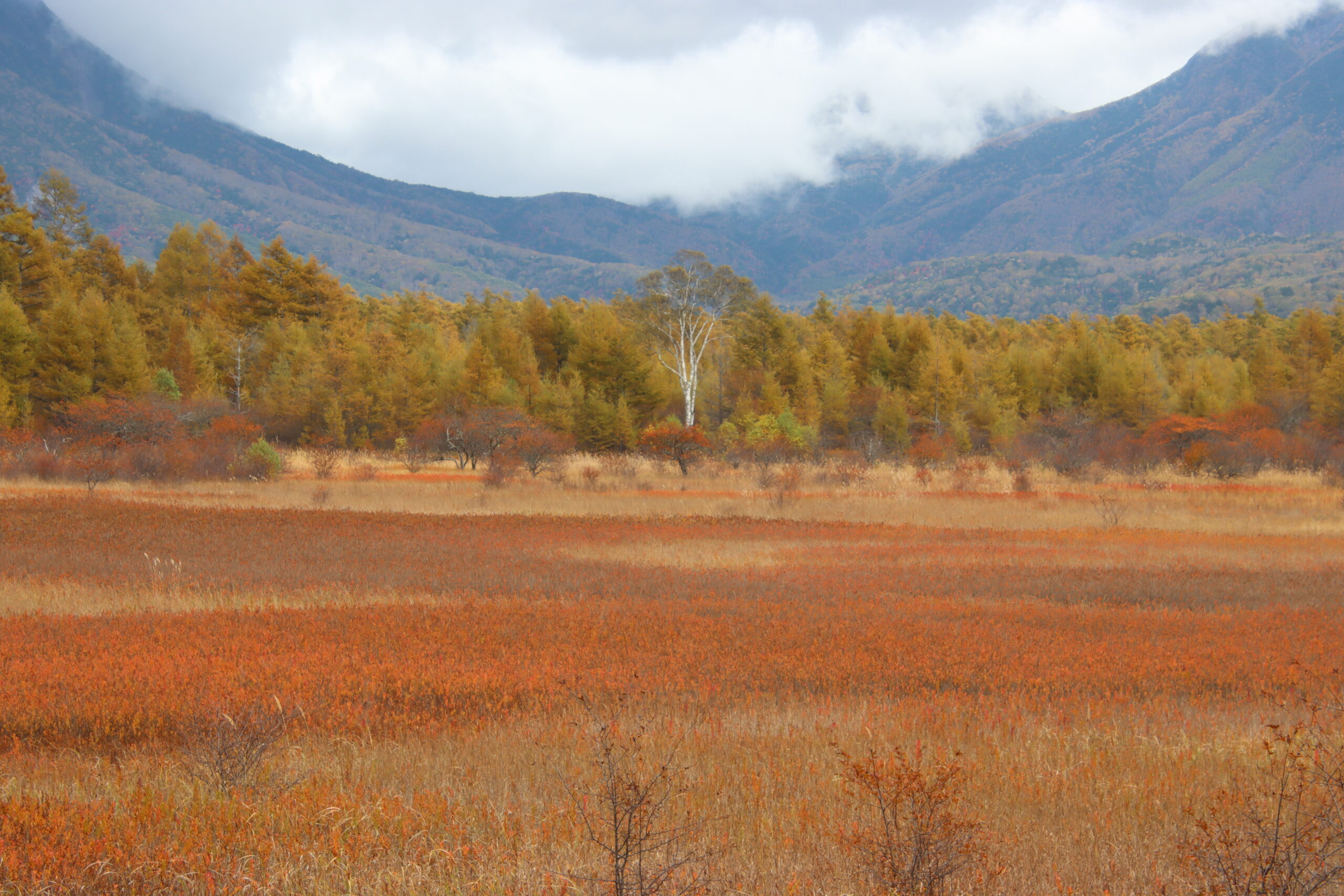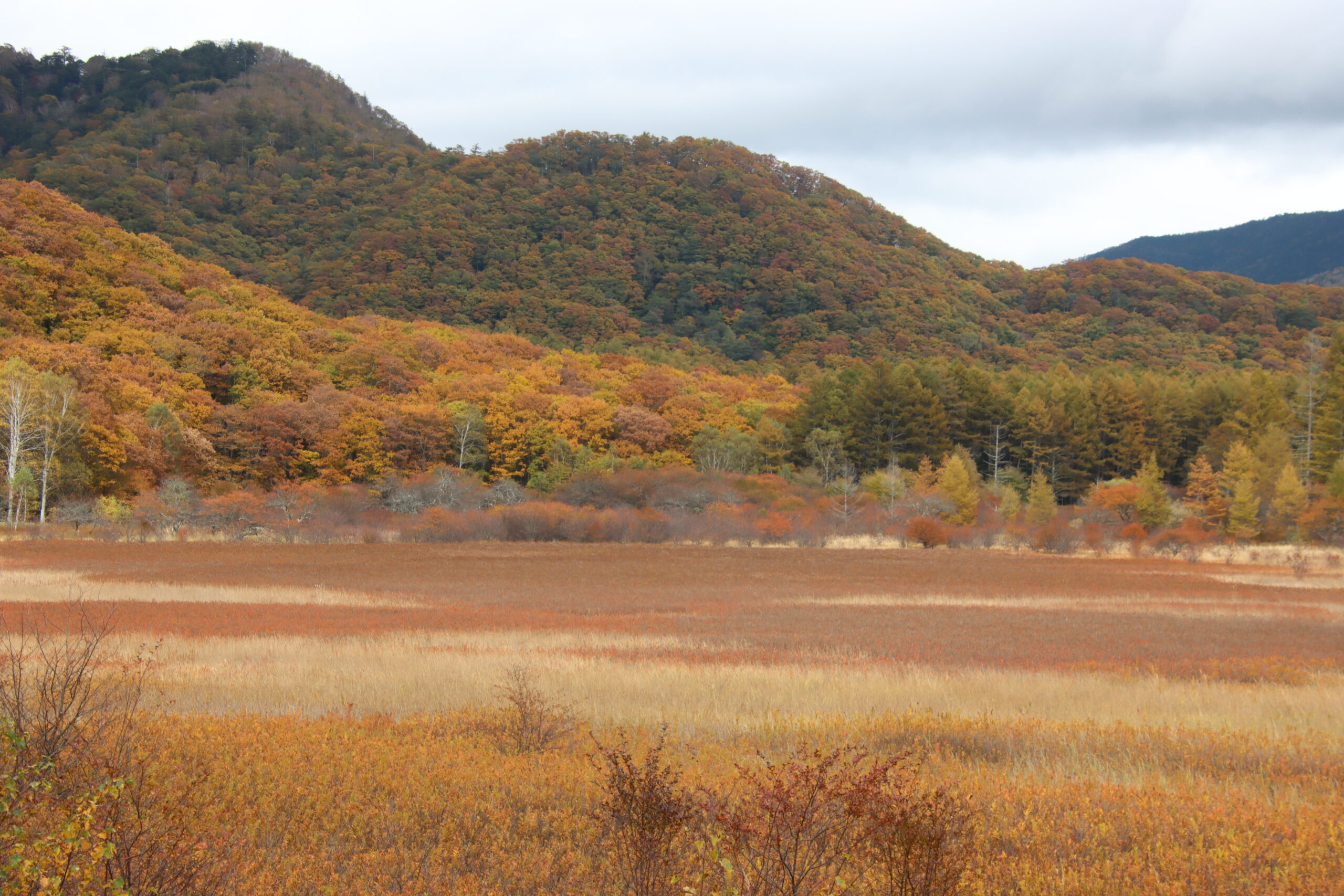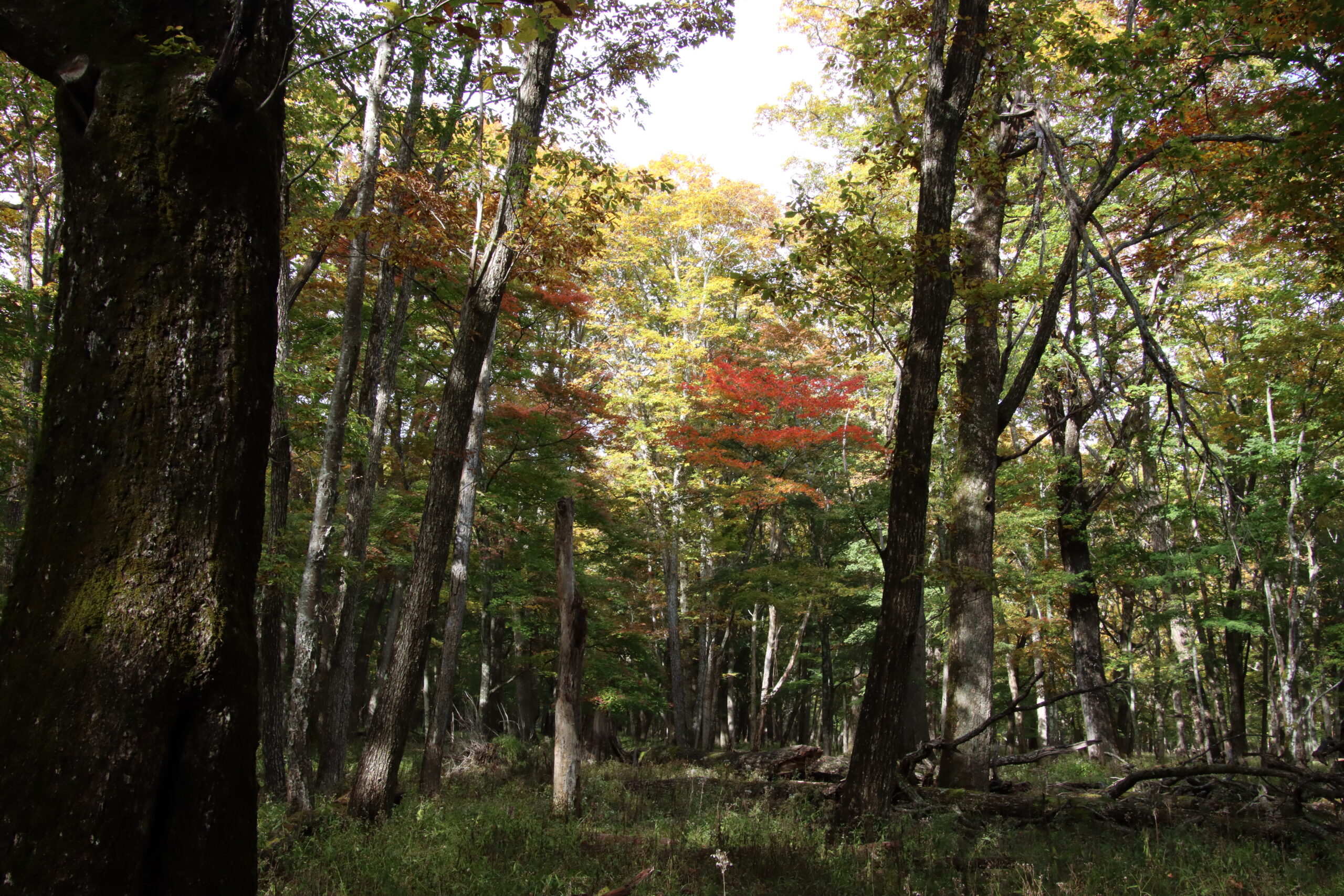 千手ヶ原のハイキングコースでもミズナラやカエデが色づいていました。ミズナラは葉が傷むスピードが速いので