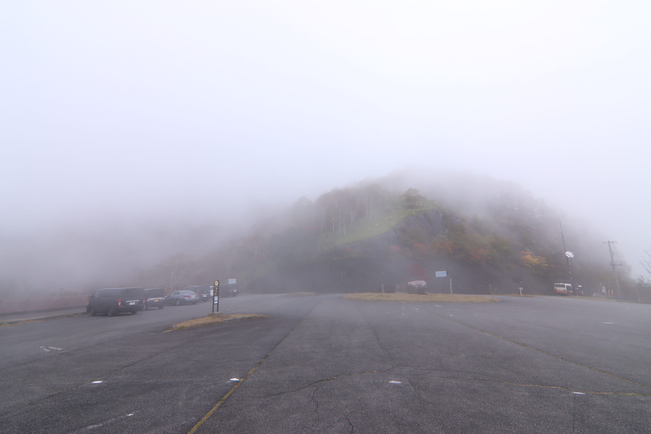 そして半月山展望台に到着!しましたが、半月山は濃霧に包まれていたため、展望台は断念。かろうじて足尾側の様子を見ることができました。