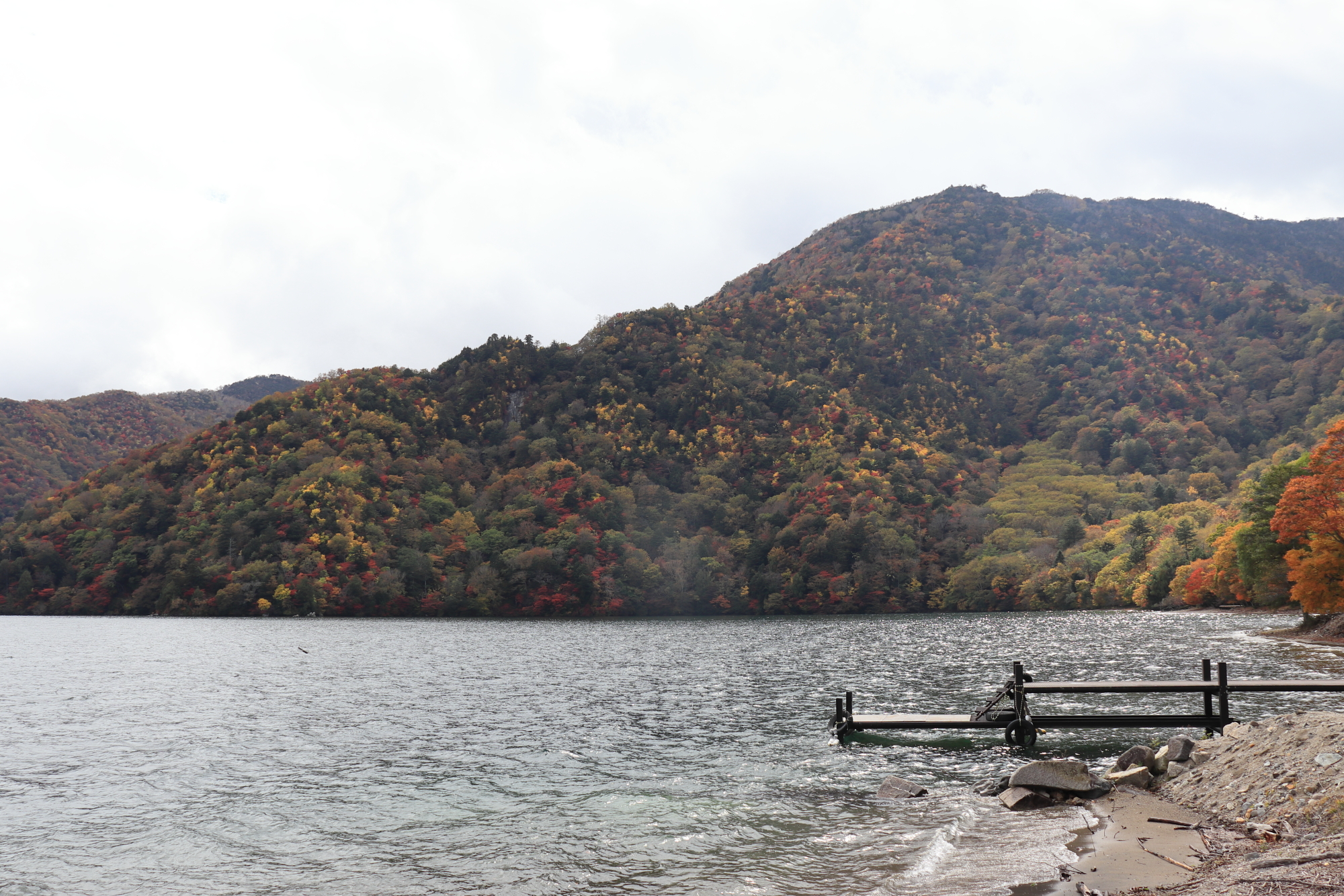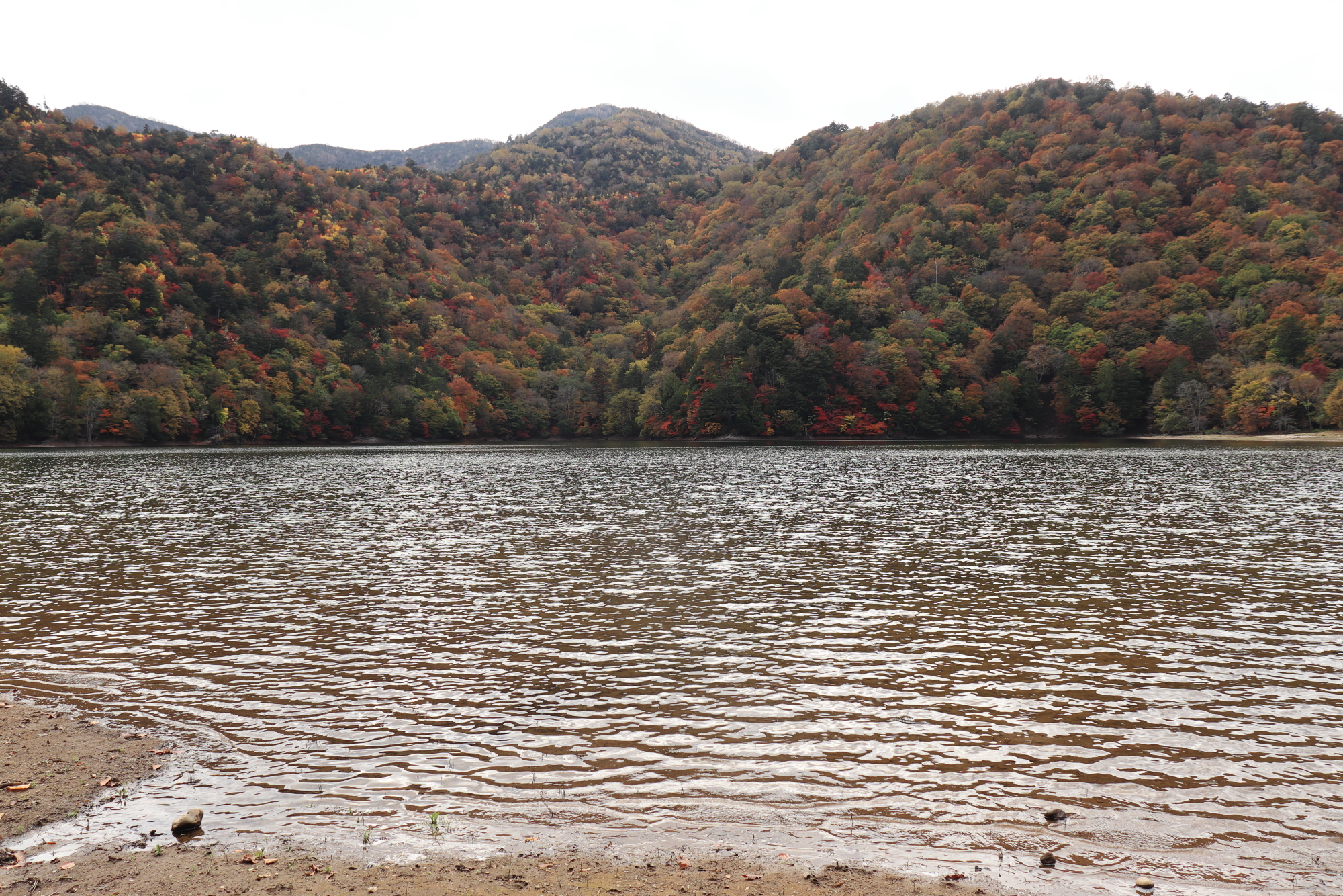 西ノ湖の周りの山肌は見頃を迎えています。赤も黄色もかなり濃く鮮やかに色が出ていて見ごたえ抜群です。