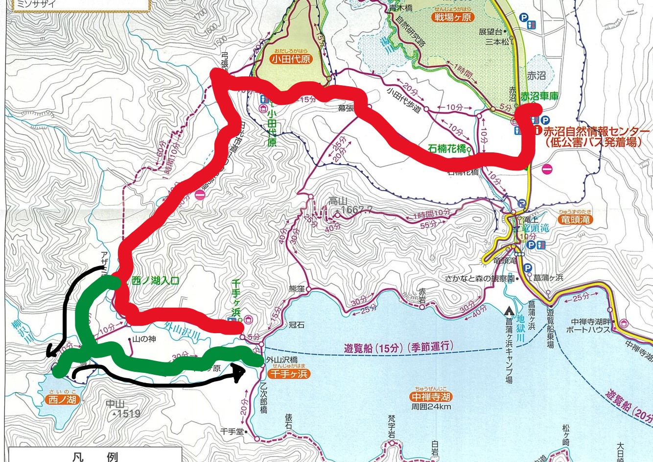 今回のルートは緑色でなぞった部分です。時間はトータルで1時間半~2時間ほどかかります。赤くなぞった部分は低公害バスが通るルートです。ぜひ、うまく利用して奥日光の紅葉を楽しんでください。また、かなり寒くなってきました。防寒着、手袋など暖かい服装でお越しください。