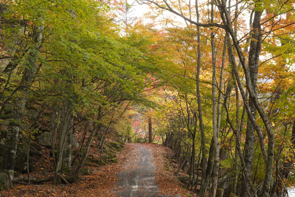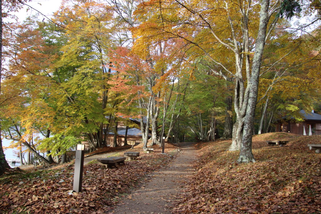 湖岸の歩道ではまだ緑色も目立ちますが、色づいている木も多く見頃ですね。