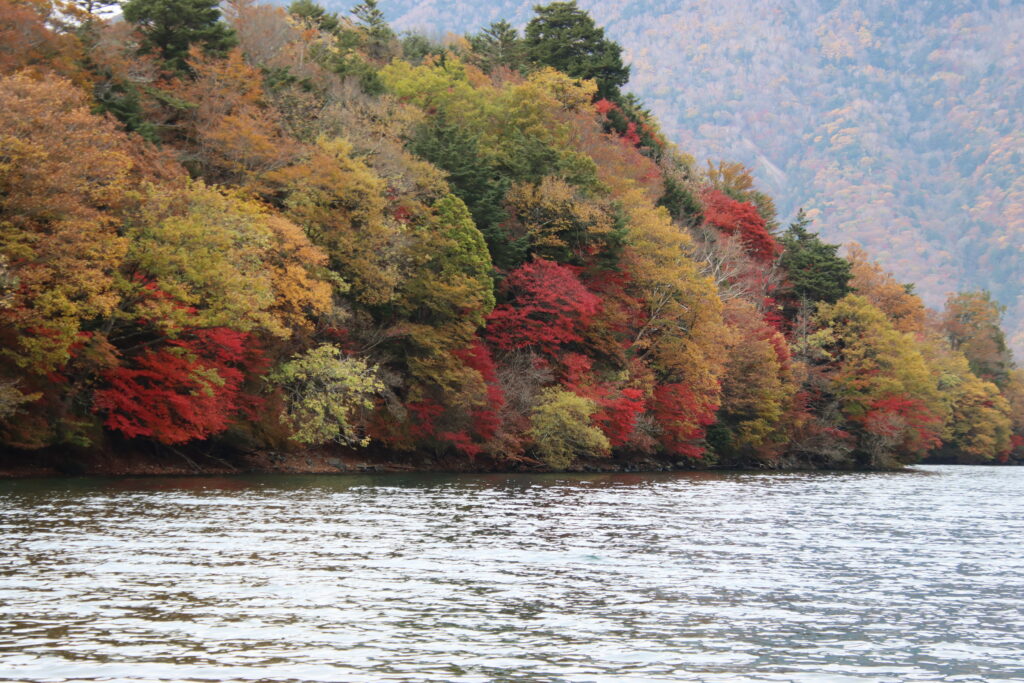 中禅寺湖の紅葉もピークを迎えています。