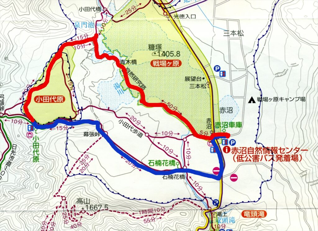 (※青色が低公害バス、赤色が自分で歩いた場所になります。)
