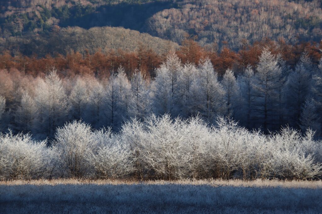 朝日に照らされて白く輝く木々たちはまさに自然の芸術!この光景は気温が上がり始める7時過ぎまで楽しめました。