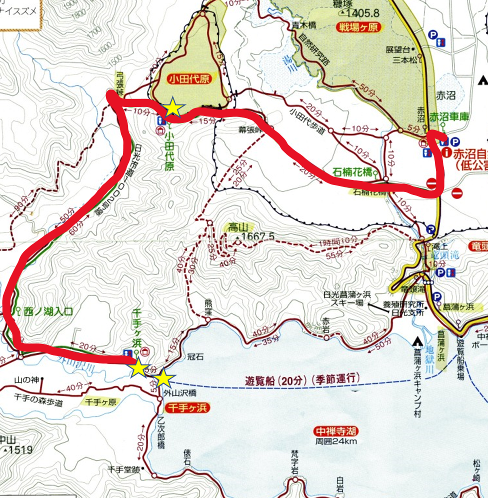 今回の紹介した地点は低公害バスを利用すると簡単にアクセスできますよ!(赤ライン:運行区間)