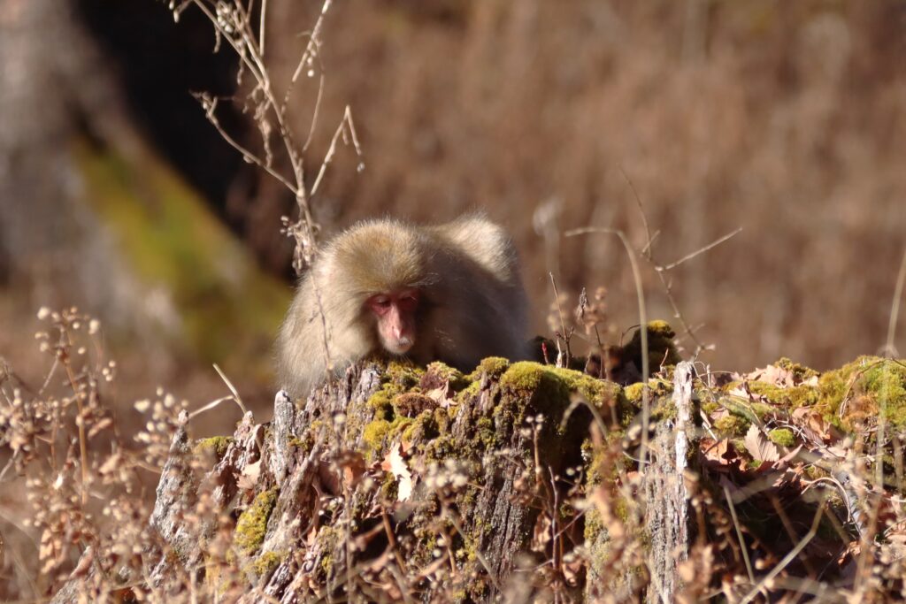 背後の森からサルの喧嘩の声が聞こえてきたので入ってみると、喧嘩をするすぐそばで、呑気に何かを珍しそうに観察する子ザルの姿を見る事が出来ました。この辺りはサルが多く、足元には糞が落ちていることがあるので要注意!