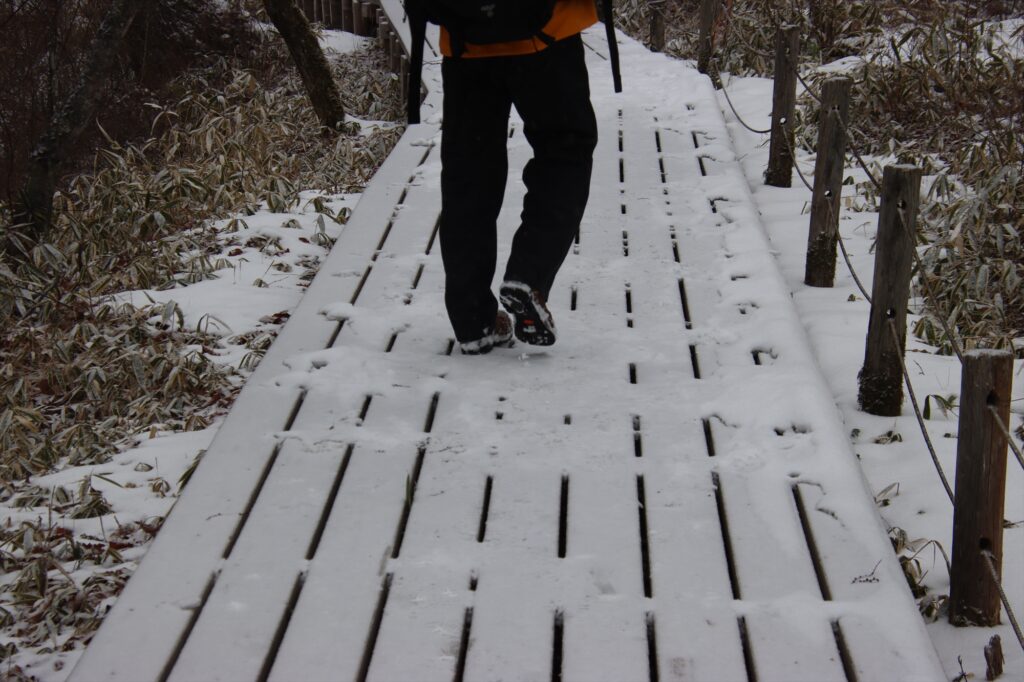 歩く際はトレッキングシューズやスノーブーツなど滑りにくい靴に加えて、スパッツの装着がおすすめです。