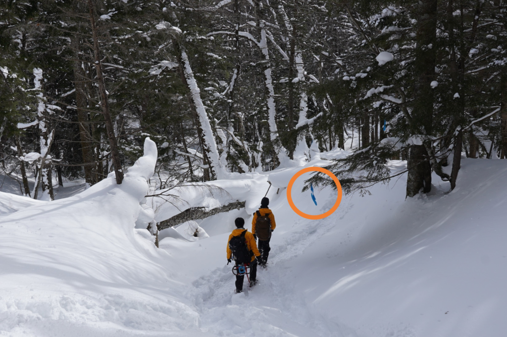 明日(1月7日)、開通となるスノーシューコースの目印となるリボン付けに行ってまいりました。