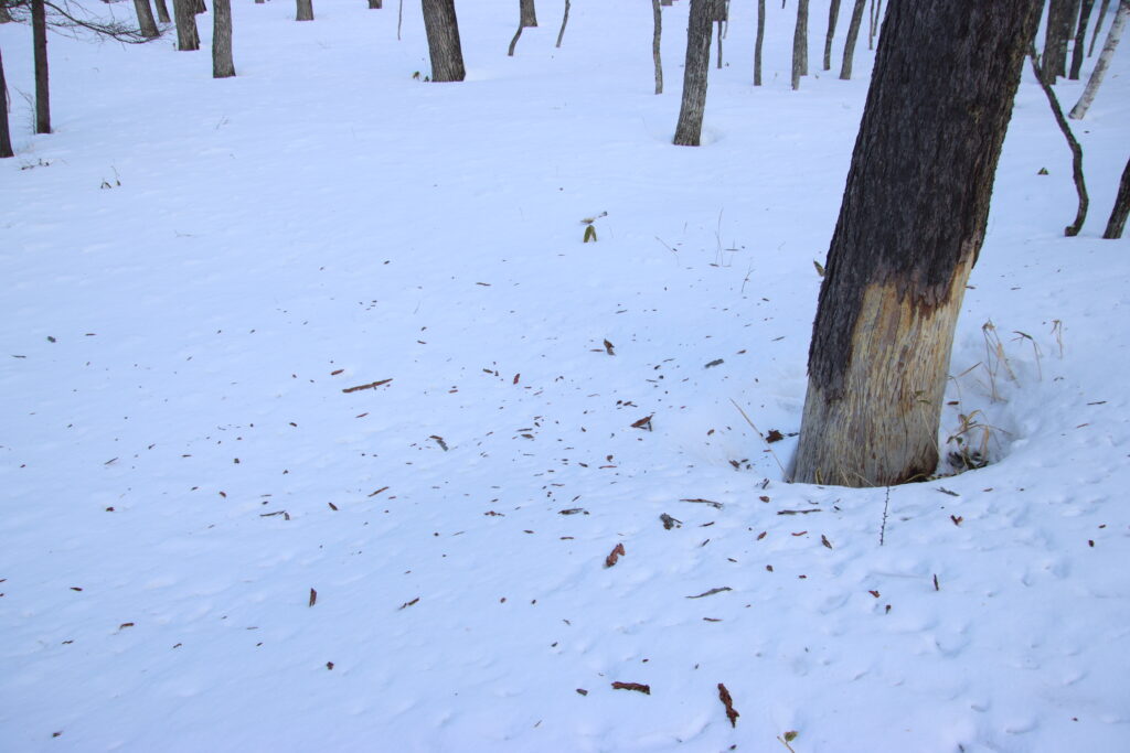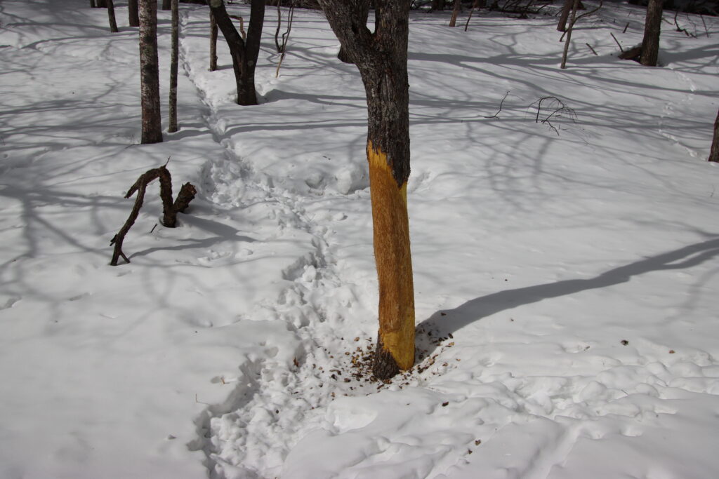 ササを十分に食べることが出来ないシカは、厳しい冬を乗り越えるために樹皮を食べるのです。