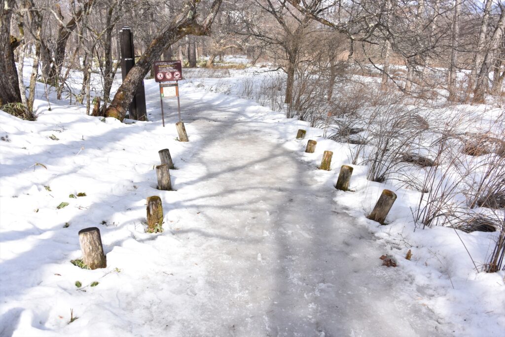 雪の残る戦場ヶ原では、湿原部に三脚を立ててしまったり、誤って立ち入ってしまったりすることがあります。