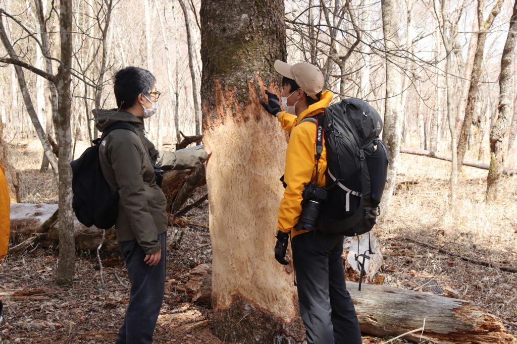 シカが木の皮を食べた跡から、シカの増加が問題になっていること。ある生き物が増加するとバランスが崩れ他の生き物にも多大な影響がでてしまうこと・生き物のつながり(生態系)は複雑であり繊細であることなどをお話しさせていただきました。