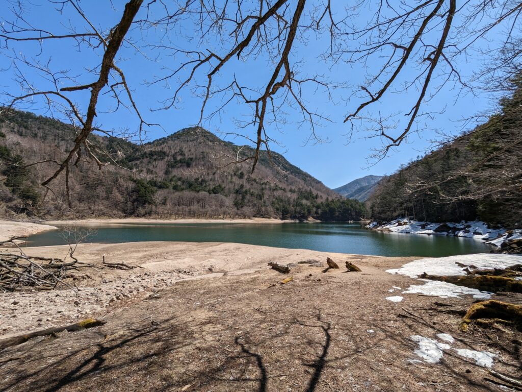 途中の小峠から湖畔までは、しっかりと雪が残っていました。
