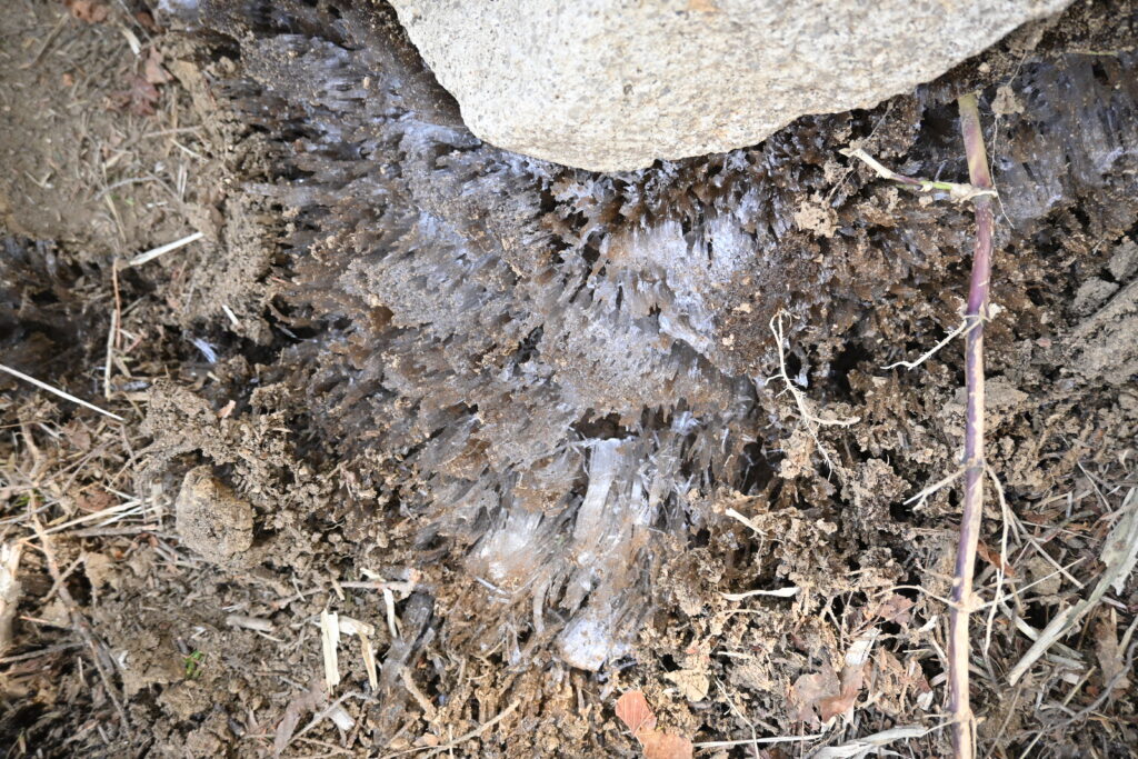 音の正体はなんと霜柱でした!5月も目前の花が見頃を迎えるような時期ですが、標高1700m近い場所では朝晩の気温は氷点下まで下がる真冬のような寒さです。それに加えて亜高山帯に生えるコメツガなどの針葉樹が日陰を作って、日が出た後でも氷が融けずに残っていたようです。
