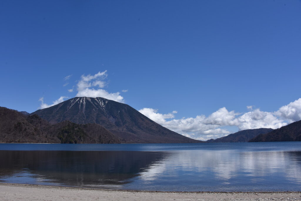 撮影を終えて、千手の森歩道を進んでいくと男体山が湖畔に写り込む千手ヶ浜が見えてきました。