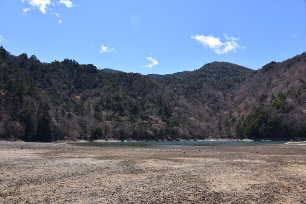 撮影に没頭すること30分、西ノ湖に到着!水位の変化が激しいことで有名で、冬から春の時期はいつもの半分以下の水位となっており、広大な砂浜が広がっていました。