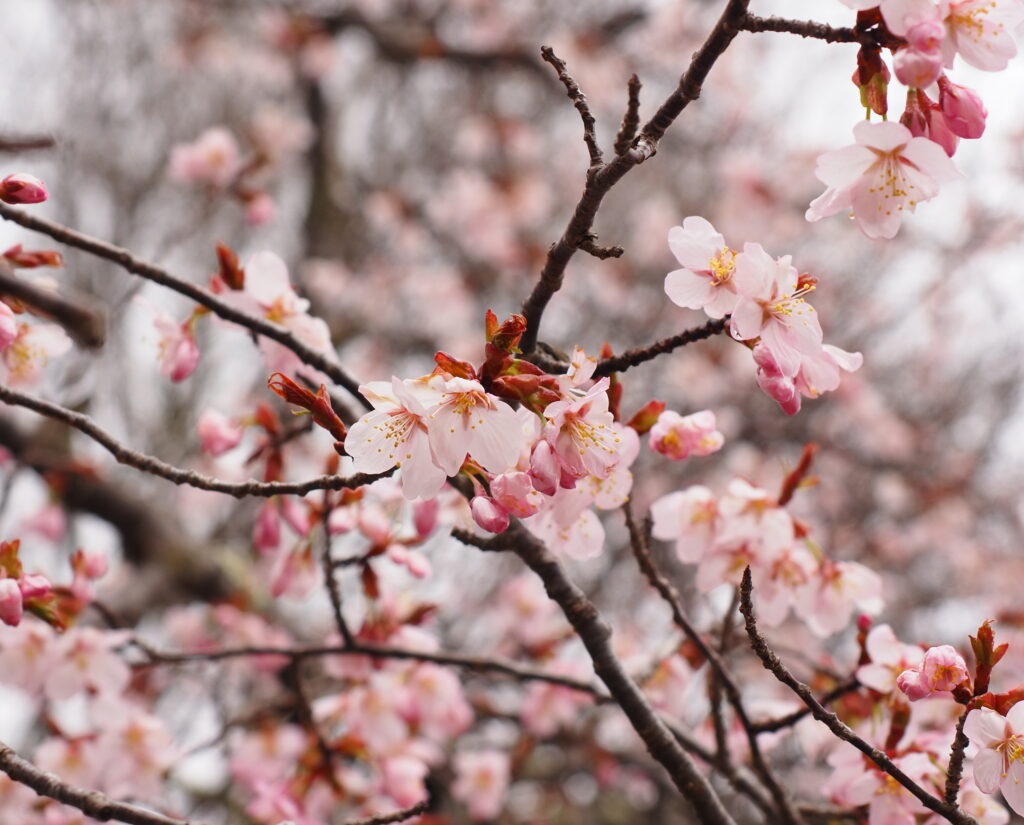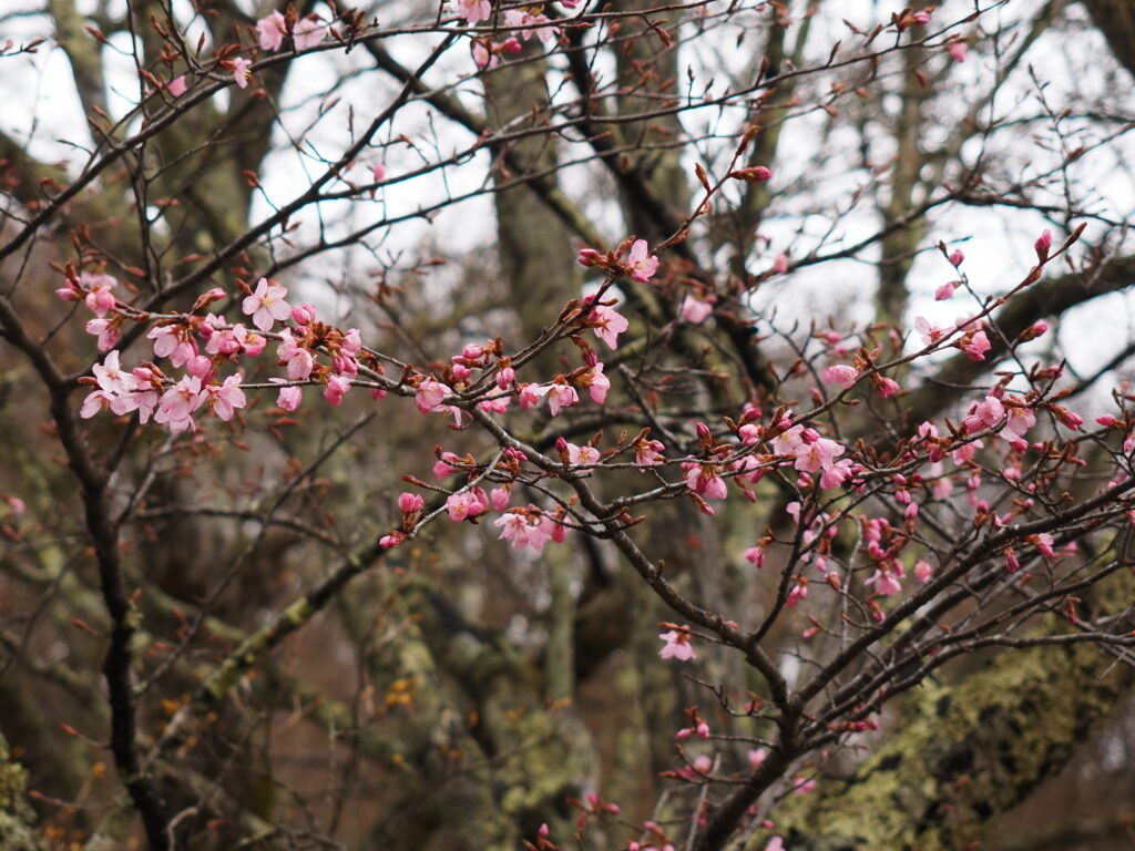 花の濃いピンク色と、出てきたばかりの葉の赤色が周囲の枯れ景色の中で一層目立ちます。