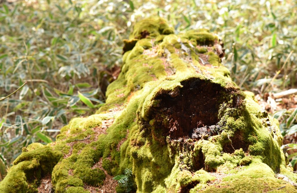 木陰のある場所では倒木についたコケが鮮やかな緑になっていました。