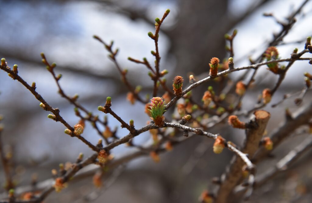 木道沿いのカラマツも新芽や花を出しています。